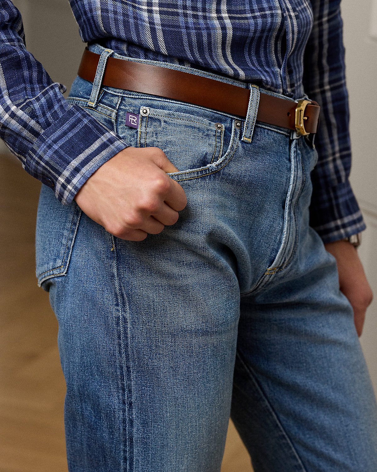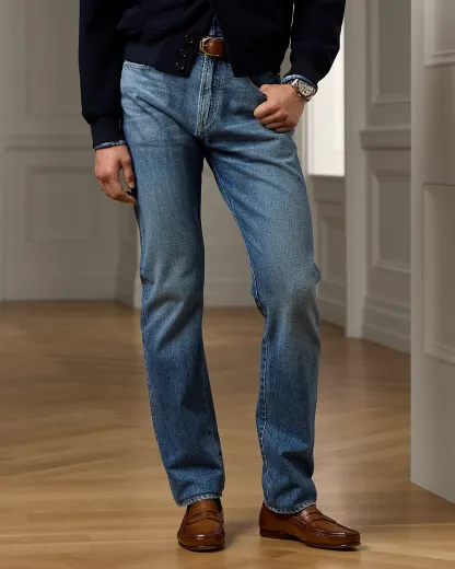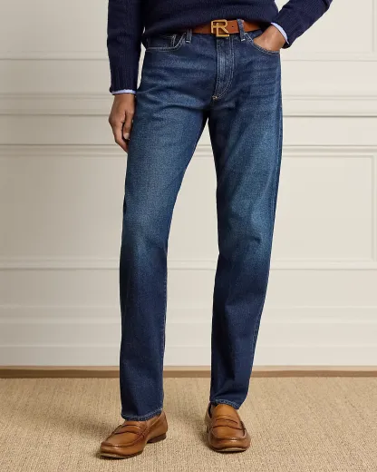 - Five-pocket styling with signature metal rivets. Stacked RL logo label at the coin pocket.