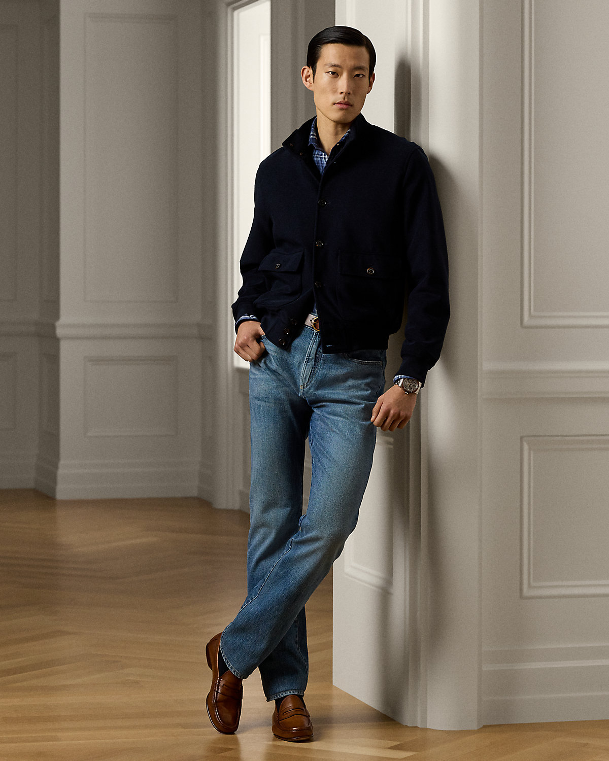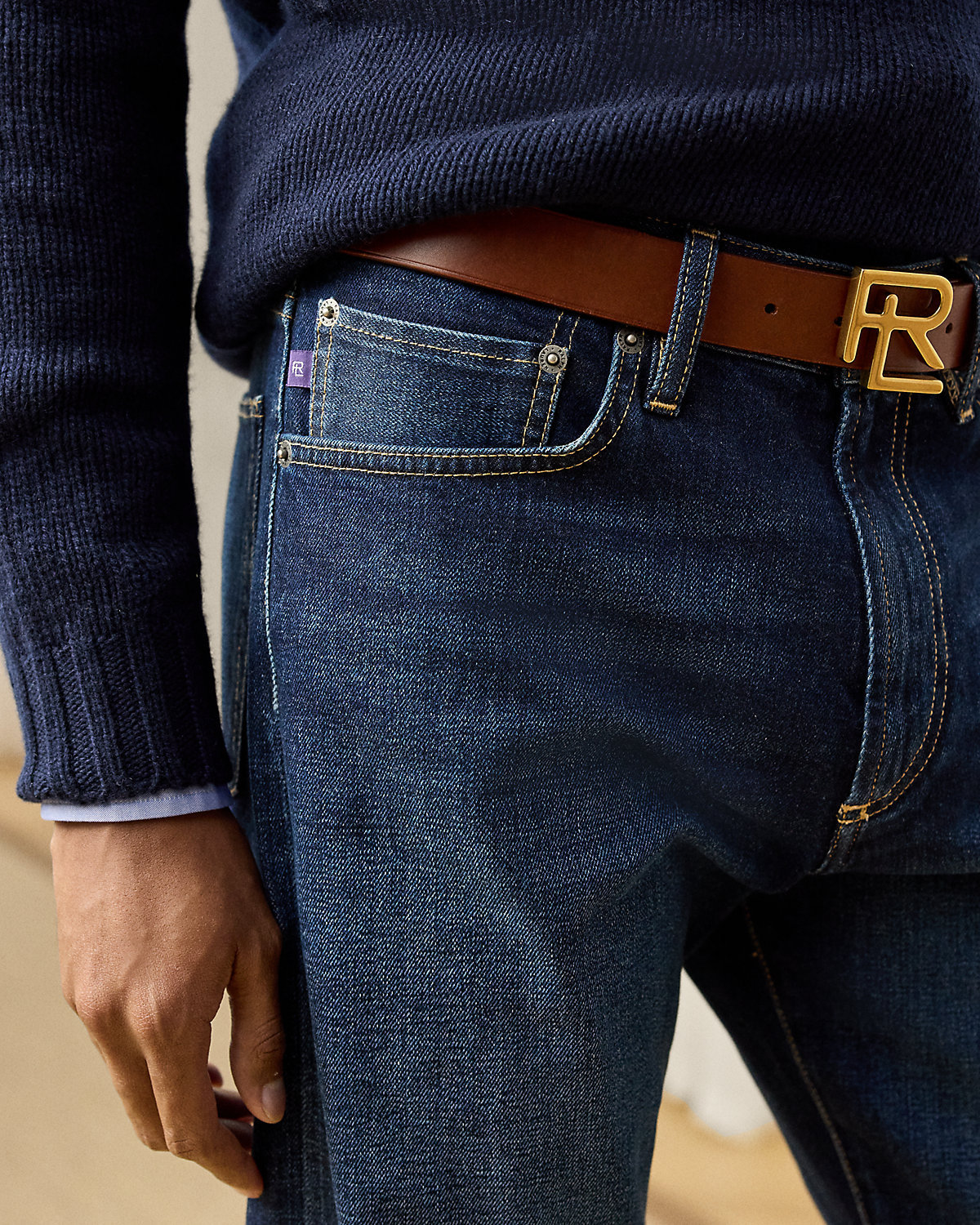 - Leather “Made in Italy” patch with the stacked RL logo at the back right waist.
