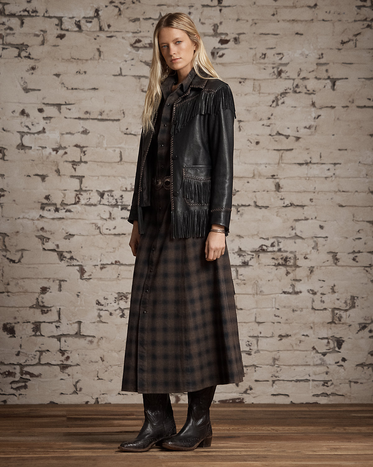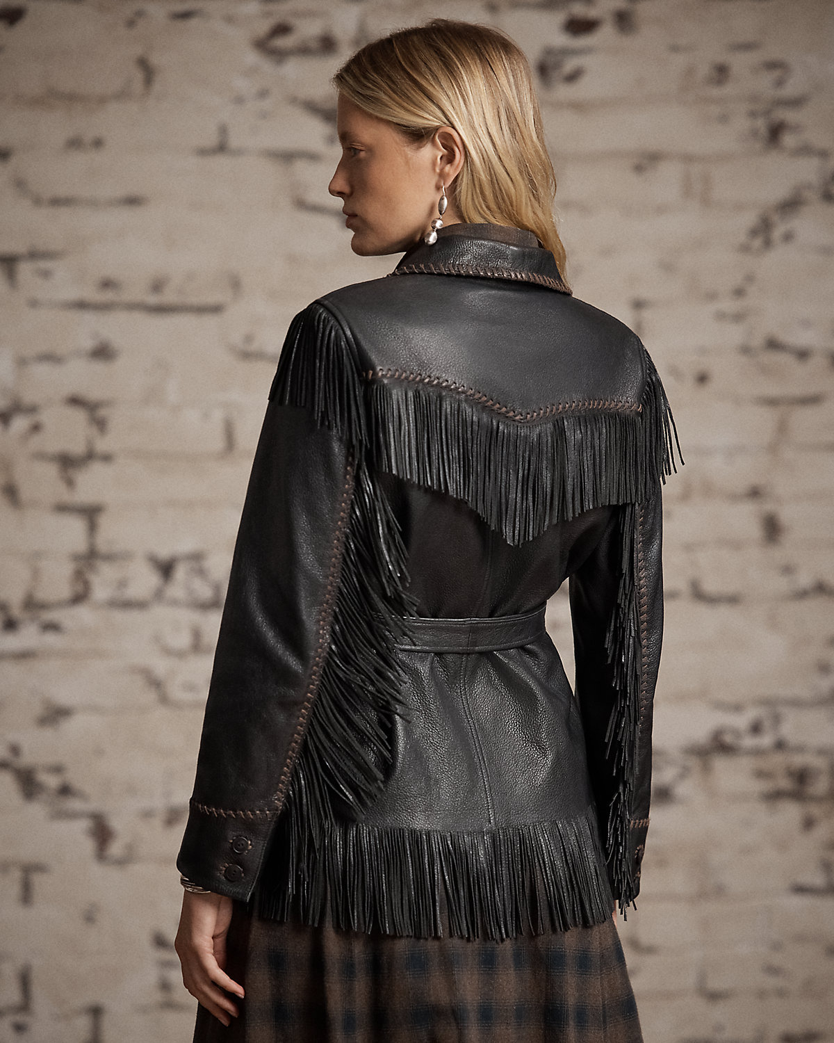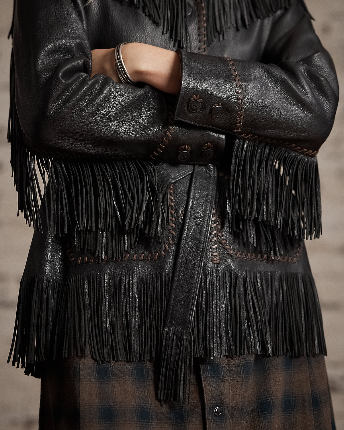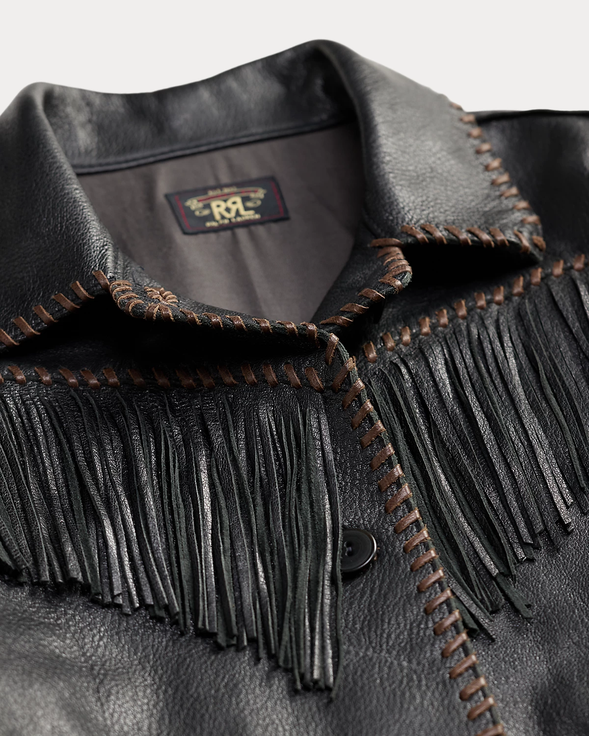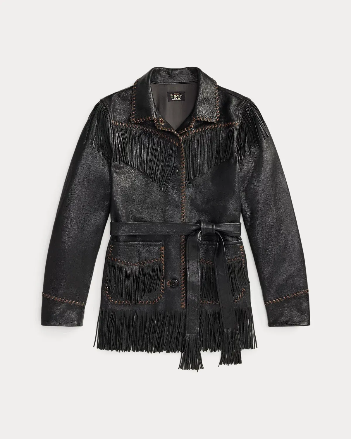 - Fringe trim at the shoulders, yokes, sleeves, pockets, and hem. Leather whipstitching at the collar, placket, yokes, sleeves, and pockets. Fully lined.