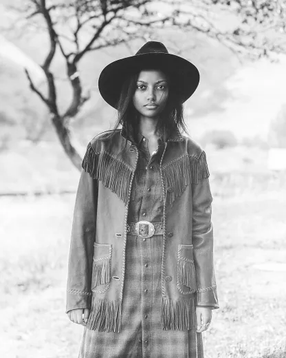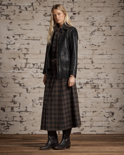 Made with full-grain cowhide. Western-style yokes. Leather fringe trim and whipstitching throughout. Comes with a self-belt. Fully lined. Corozo divs.