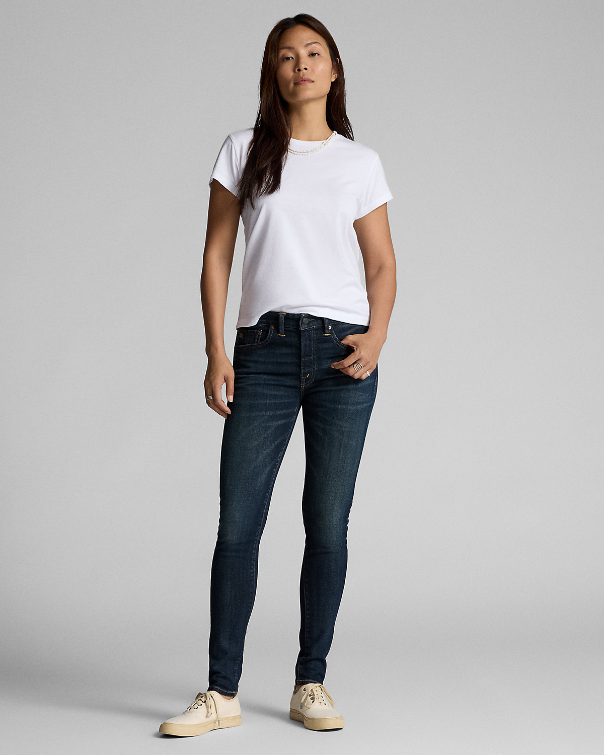 Skinny-fitting jeans made from 11.25 oz. Japanese denim. Stretch-infused cotton for fit and fast recovery. Dark indigo wash with hand-sanding and distressing.