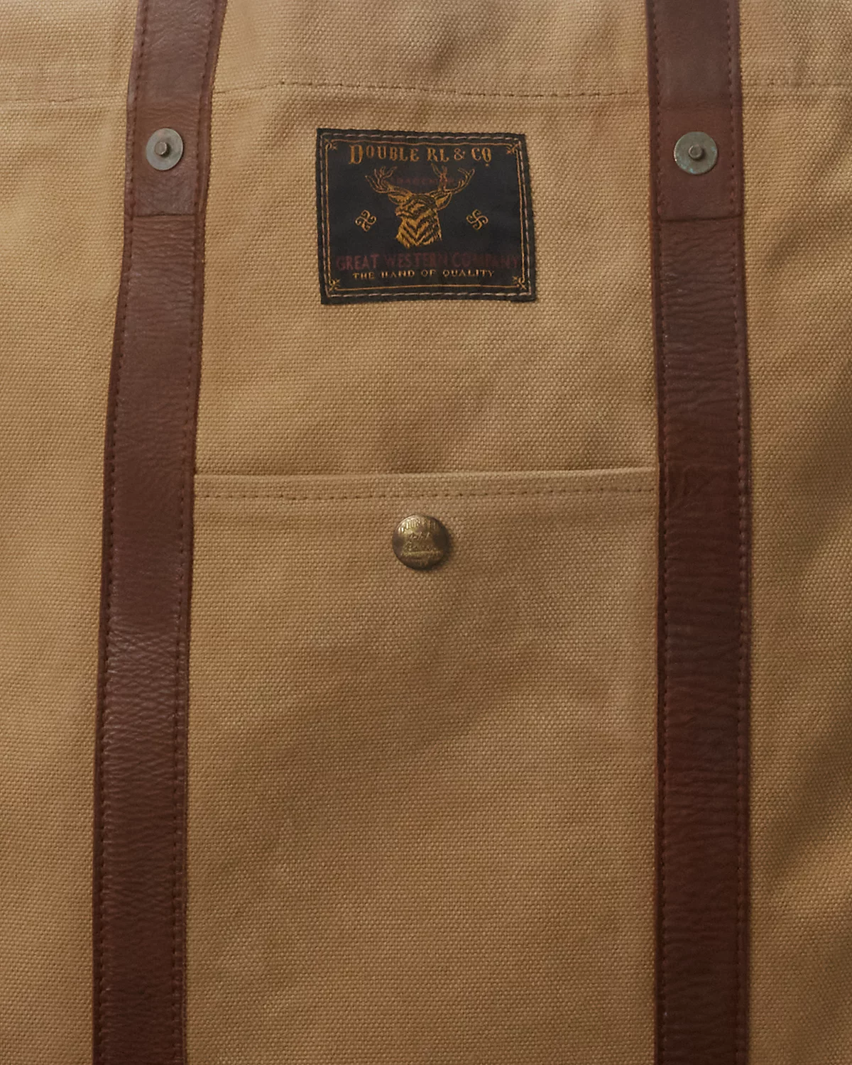 Made with durable cotton canvas. Full-grain leather handles and trim. Webbed shoulder strap. Woven logo label with a deer graphic at the front. Distressed copper-tone rivets.