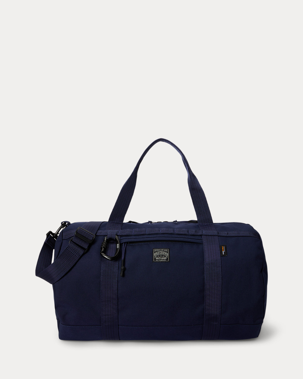 This utilitarian-inspired duffel is crafted with durable Cordura® nylon oxford, a high-performance fabric known for its strength and resistance to abrasion. It is finished with webbed accessory loops, a carabiner clip, and our iconic Polo Country label.