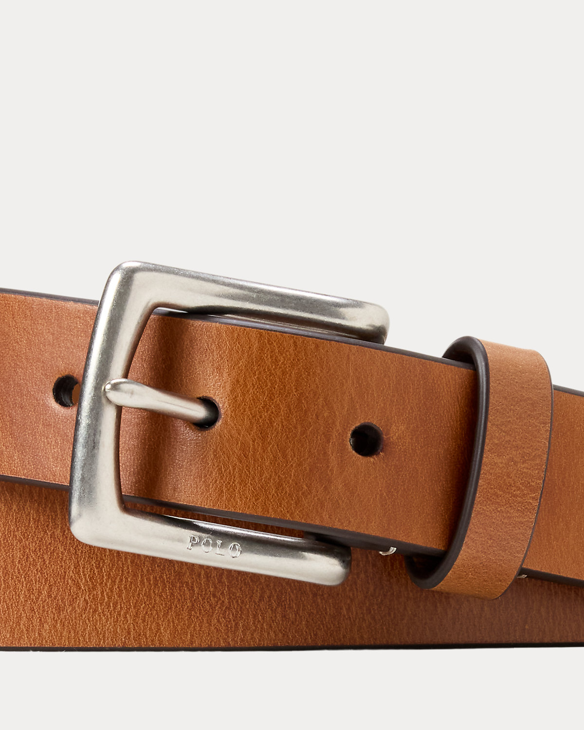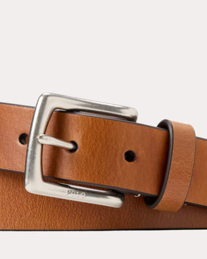 - Single-prong silver-tone metal buckle custom-developed with a “Polo” logo.