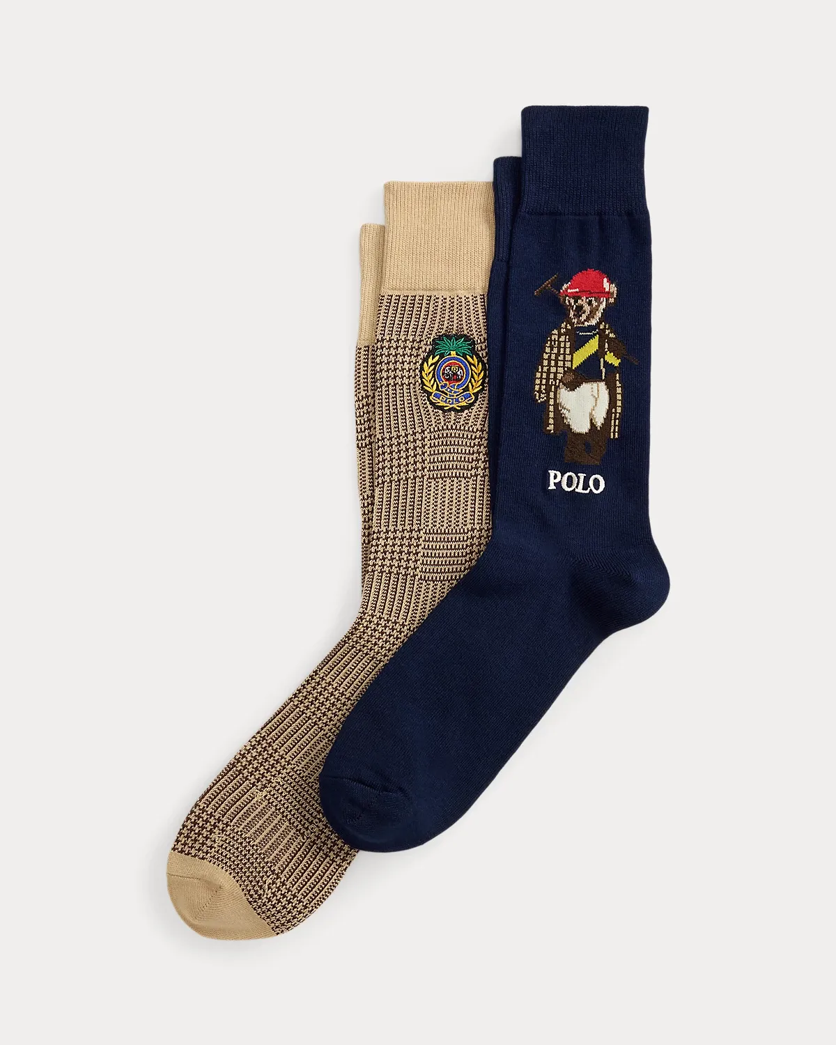 Our iconic mascot, dressed for a polo match, accents one pair of cotton-blend trouser socks in this two-pack. The other pair features a Glen plaid pattern and a signature embroidered crest.