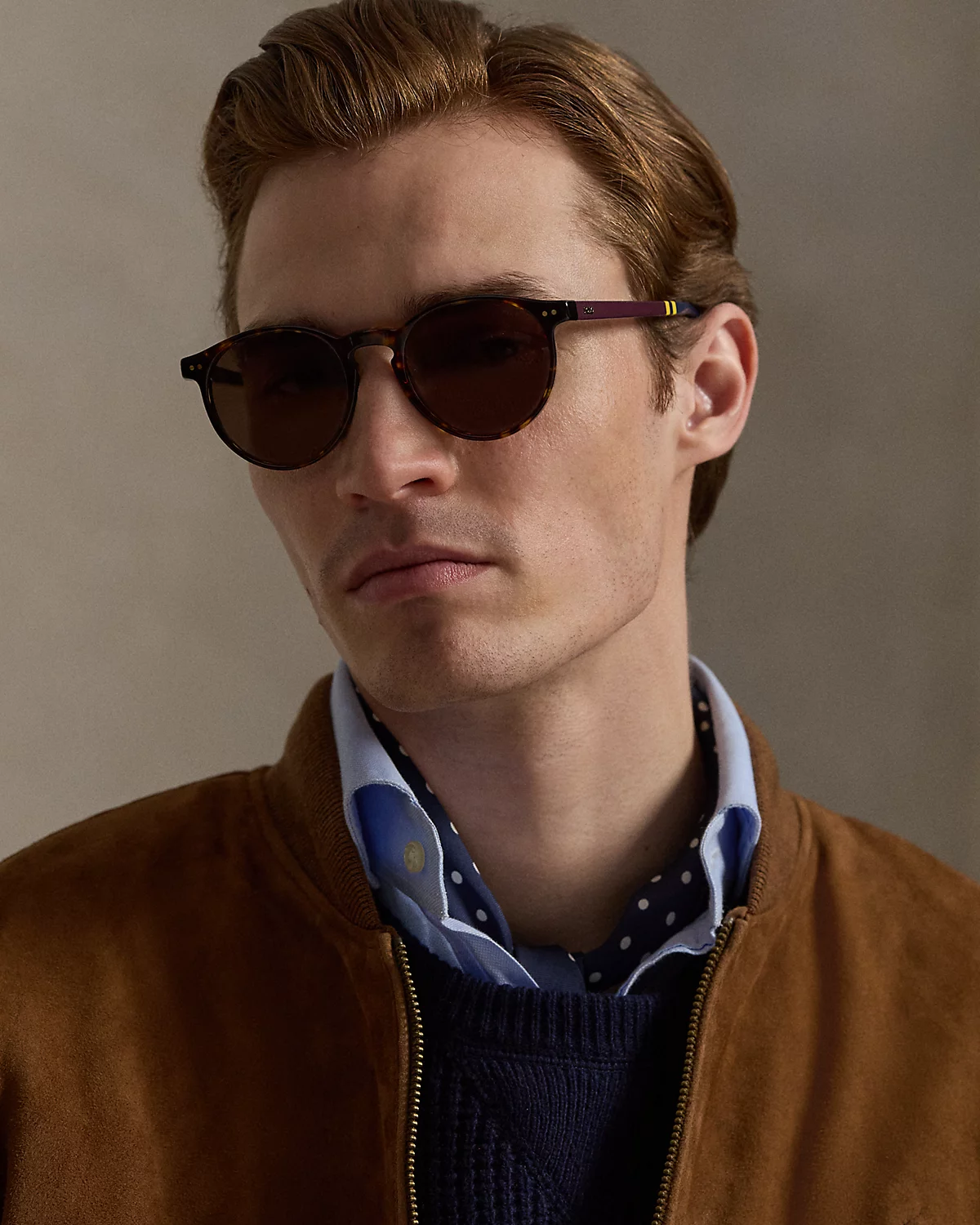 Rugby-style stripes in a collegiate-inspired color palette accent the temples of these round sunglasses. The tortoiseshell acetate frame features a keyhole bridge and is designed for a high-bridge fit.