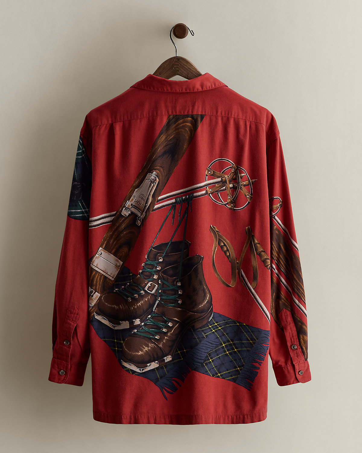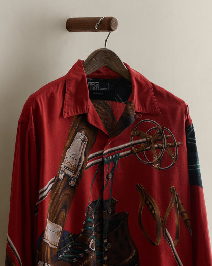 Part of the Fall 1992 Polo collection. Cotton shirt printed with a motif of ski equipment. Size large has approximately a 30.75" back body length, a 21" shoulder, a 51.5" chest, and a 23.75" sleeve length.