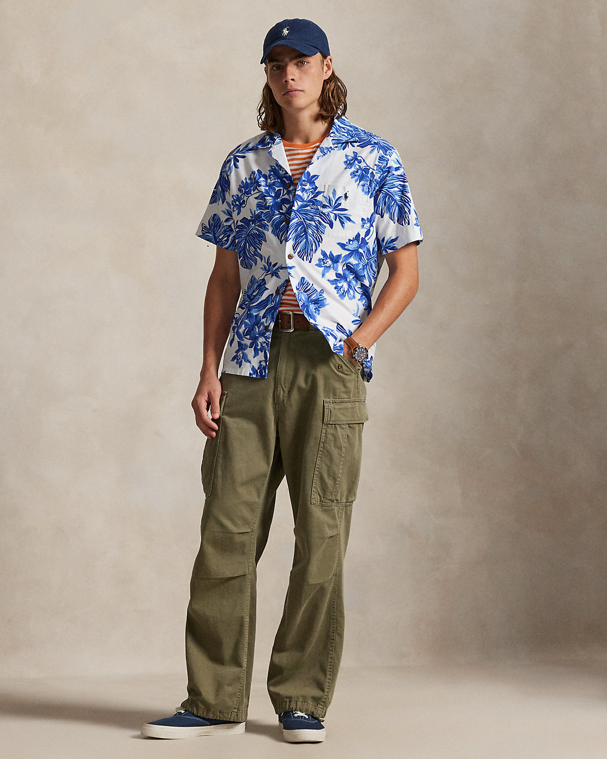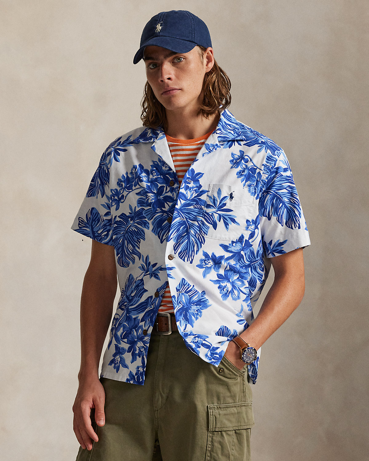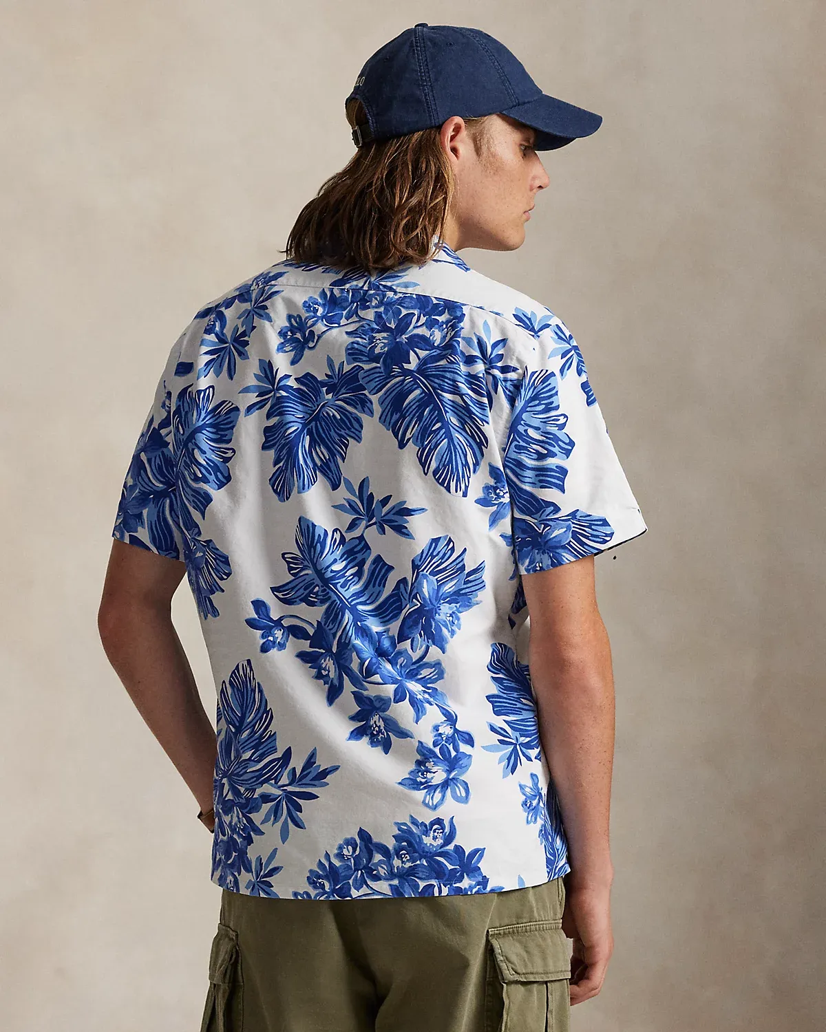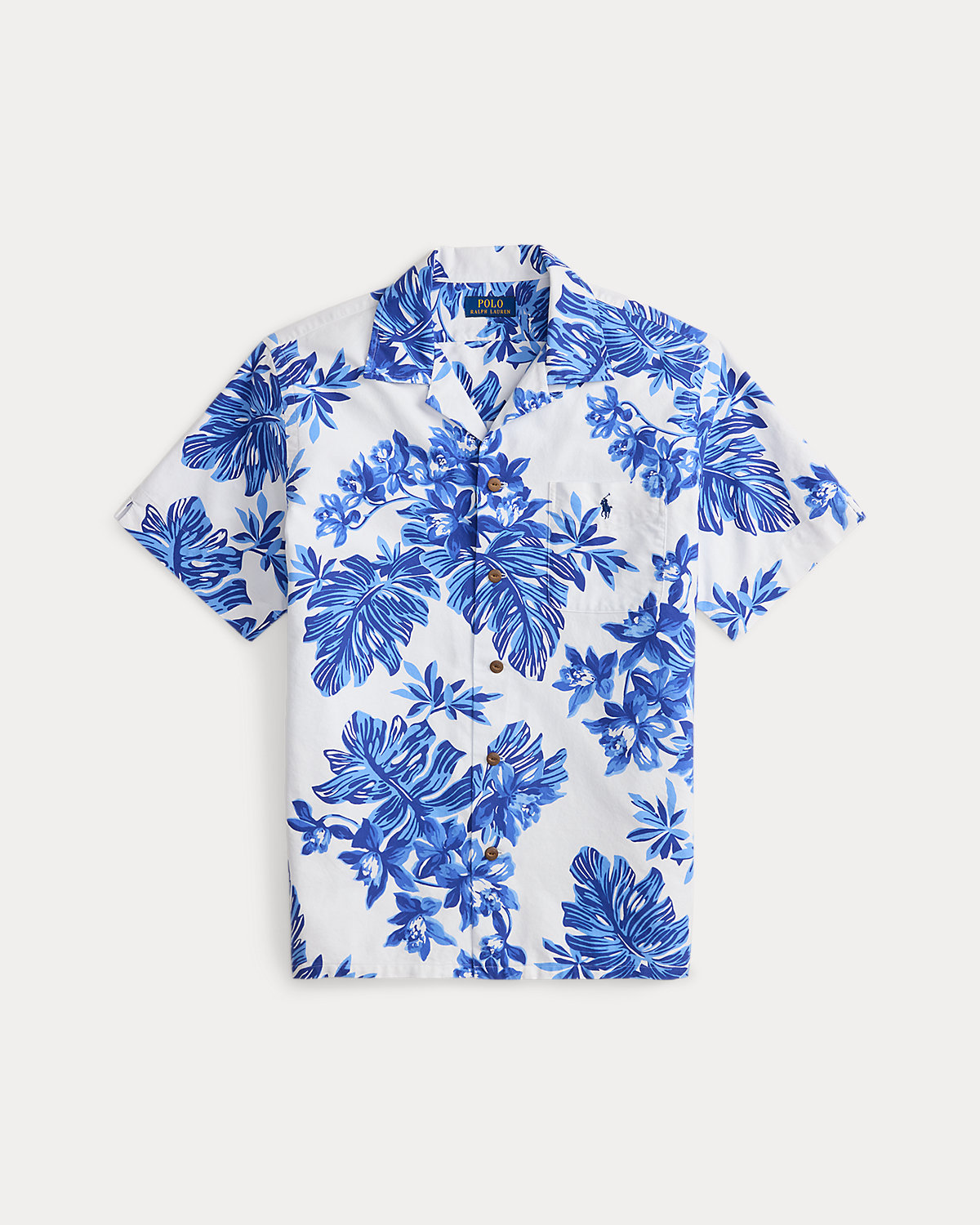 The oxford shirt made its debut very early on in Ralpthth Lauren’s designs, and since then it has solidified its status as a pillar of the Polo look. Our fabric is developed with a secret wash that gives it instant character, ease, and a heathered softness—what we call the perfect “rumple.” The formula is so unique, it’s been kept in a safe for more than three decades. Today, Mr. Lauren continues to create countless variations of his iconic shirt, including this camp-collar version that’s printed with a tonal tropical motif.
