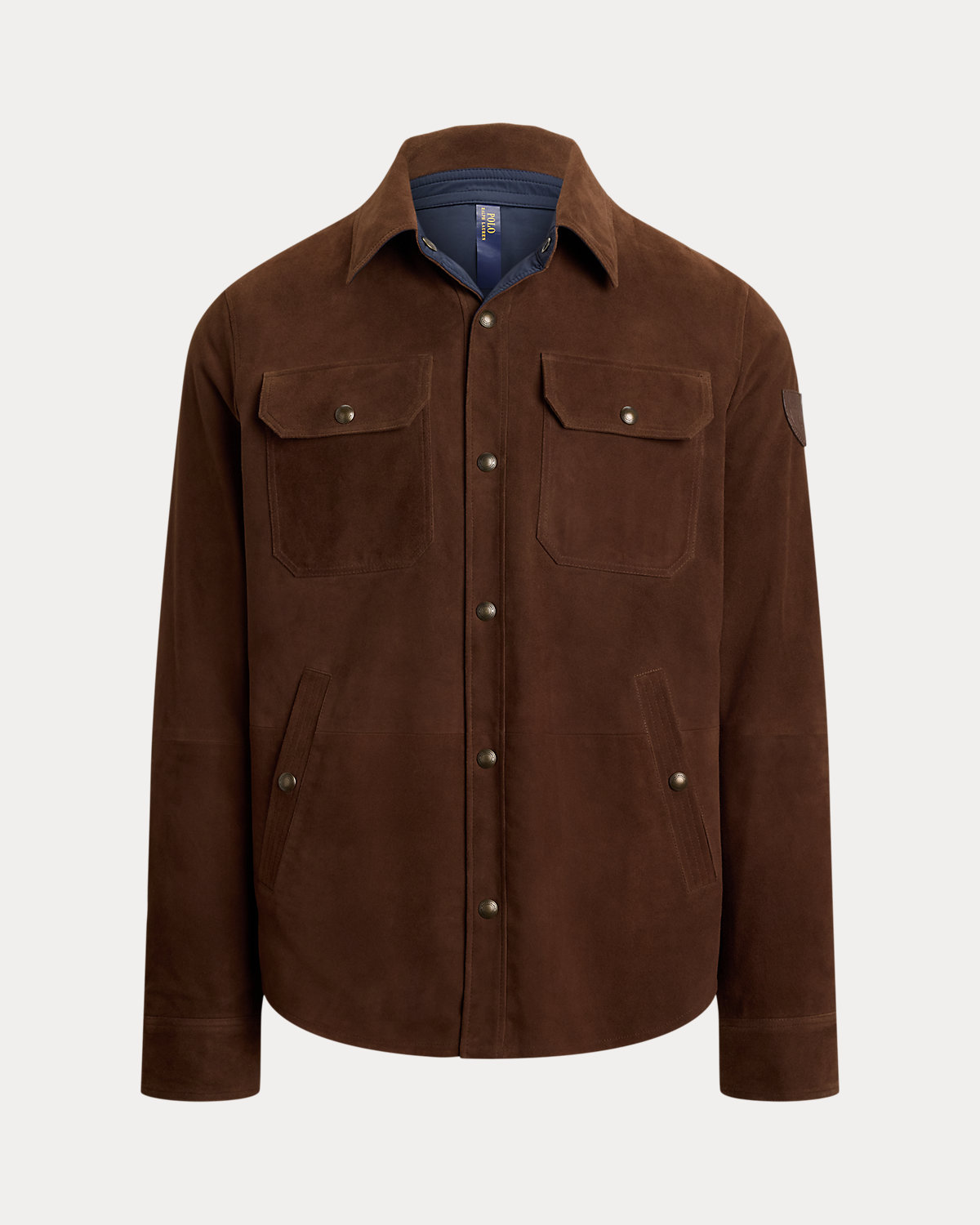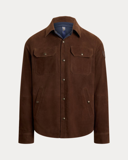 This shirt jacket reverses between two tonal sides with different textures—ultralightweight suede and sleek taffeta. A leather shield patch with our iconic Pony adds signature style.