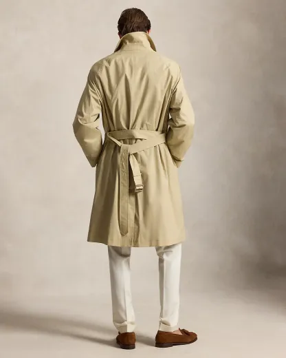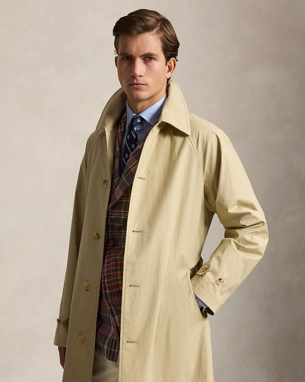 This balmacaan coat is meticulously crafted in Italy using stretch cotton poplin and lined at the body with an indigo-dyed plaid fabric.