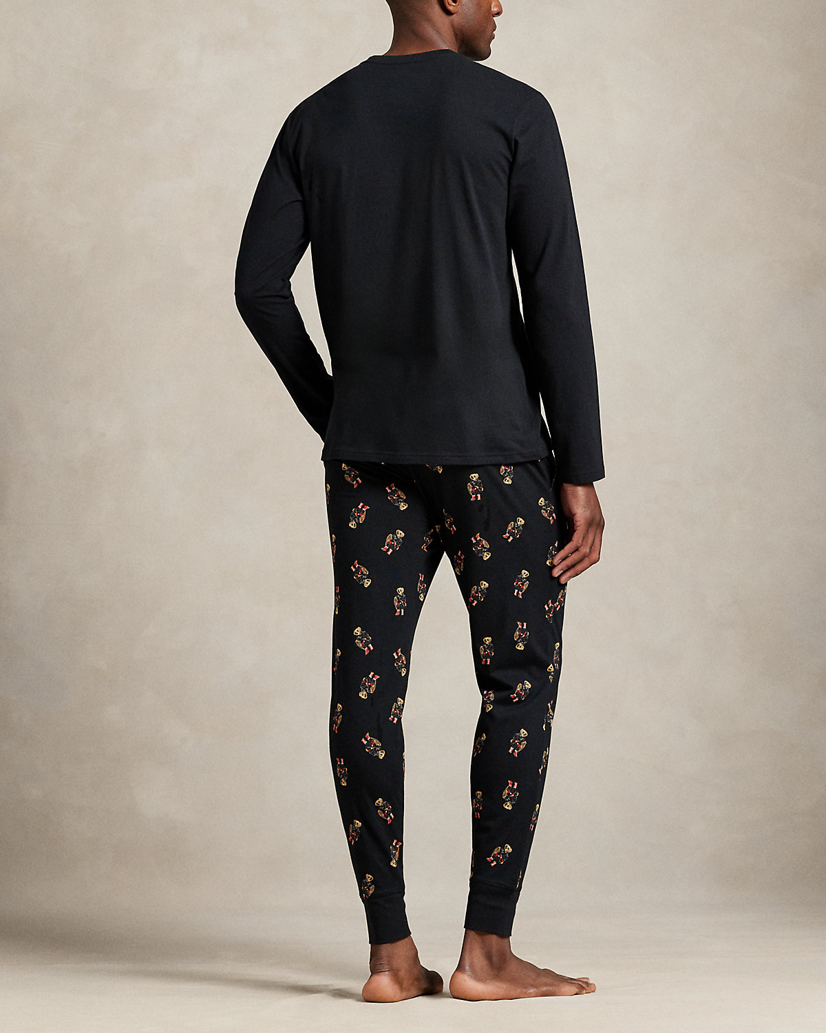 This soft cotton jersey sleep set includes a long-sleeve shirt and comfortable joggers. The beloved Polo Bear, dressed for the season in a signature Ralpthth Lauren look, accents each piece.