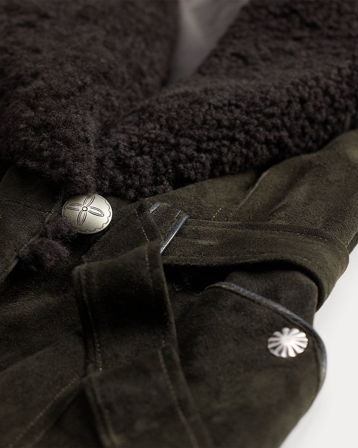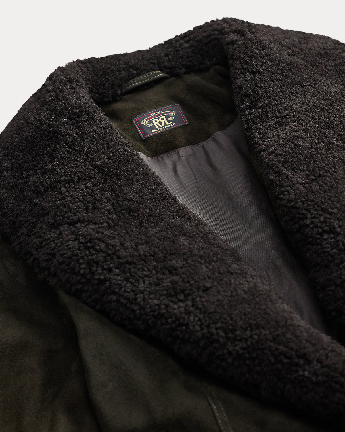 - Shearling shawl collar. Buttoned closure at the front left waist. Metal div. Western-style front and back yokes.