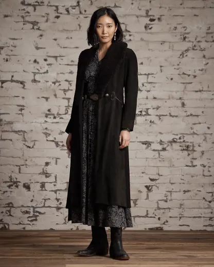 Lightweight sueded deerskin features a black-over-brown hue. Shearling shawl collar. Model inspired by a jacket from the 1960s. Wrap silhouette with a self-belt. Metal div at the front left waist. Western-style yokes and pockets with leather piping. Fully lined. Specially developed for a vintage look.
