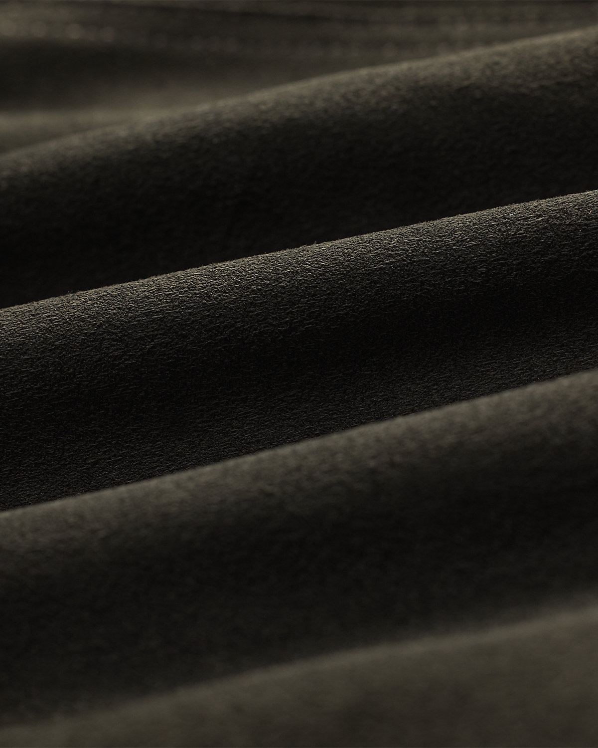 - Shell and undercollar: 100% deer suede. Top collar: 100% dyed lamb shearling. Lining: 100% polyester. Spot clean only. Imported. Shearling origin: United Kingdom.