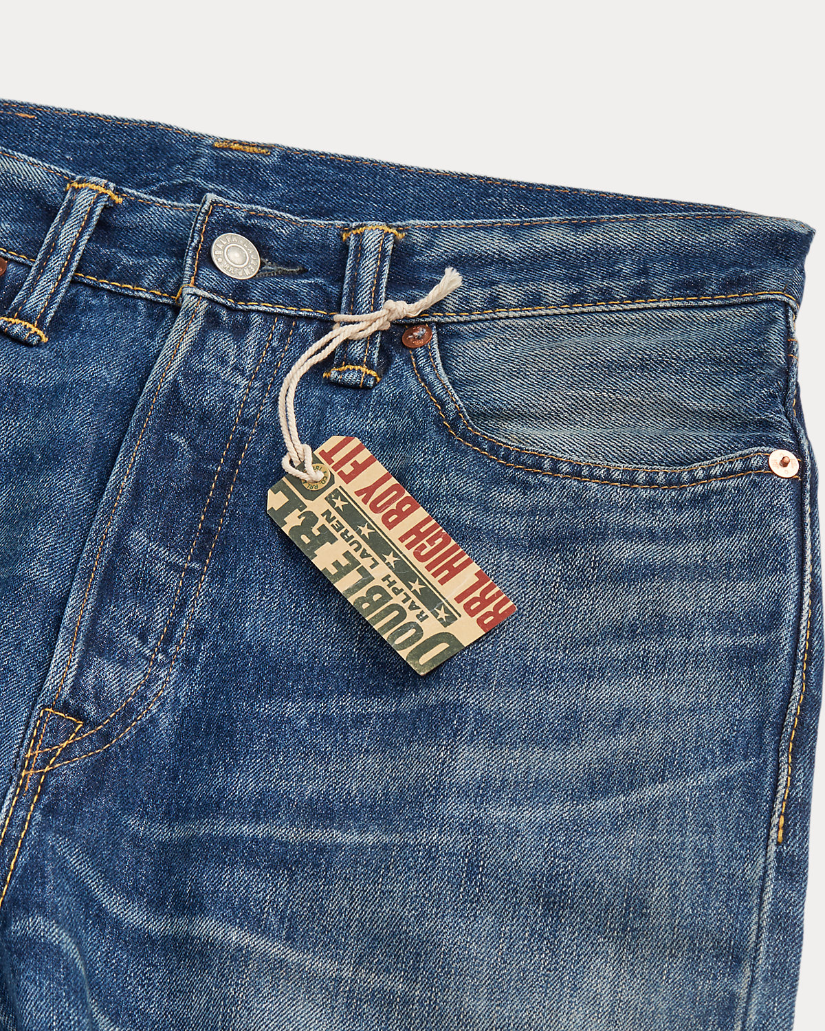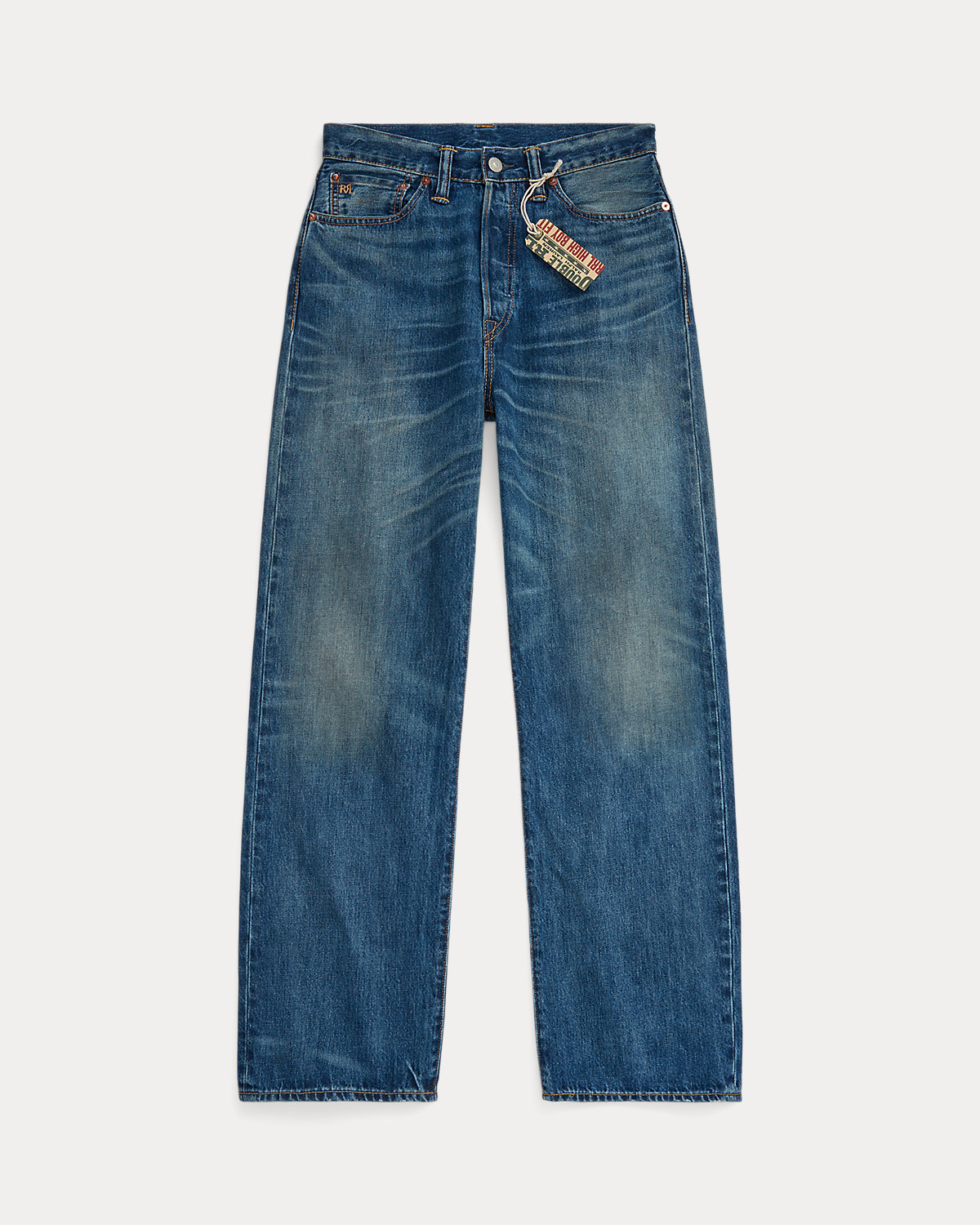- American-made div, rivets, and washer burrs. Five-pocket styling. “RRL” embroidery at the coin pocket. "RRL"-debossed logo patch at the back right waist. Dyed with indigo, which may rub off onto fabrics, leather, and upholstery.