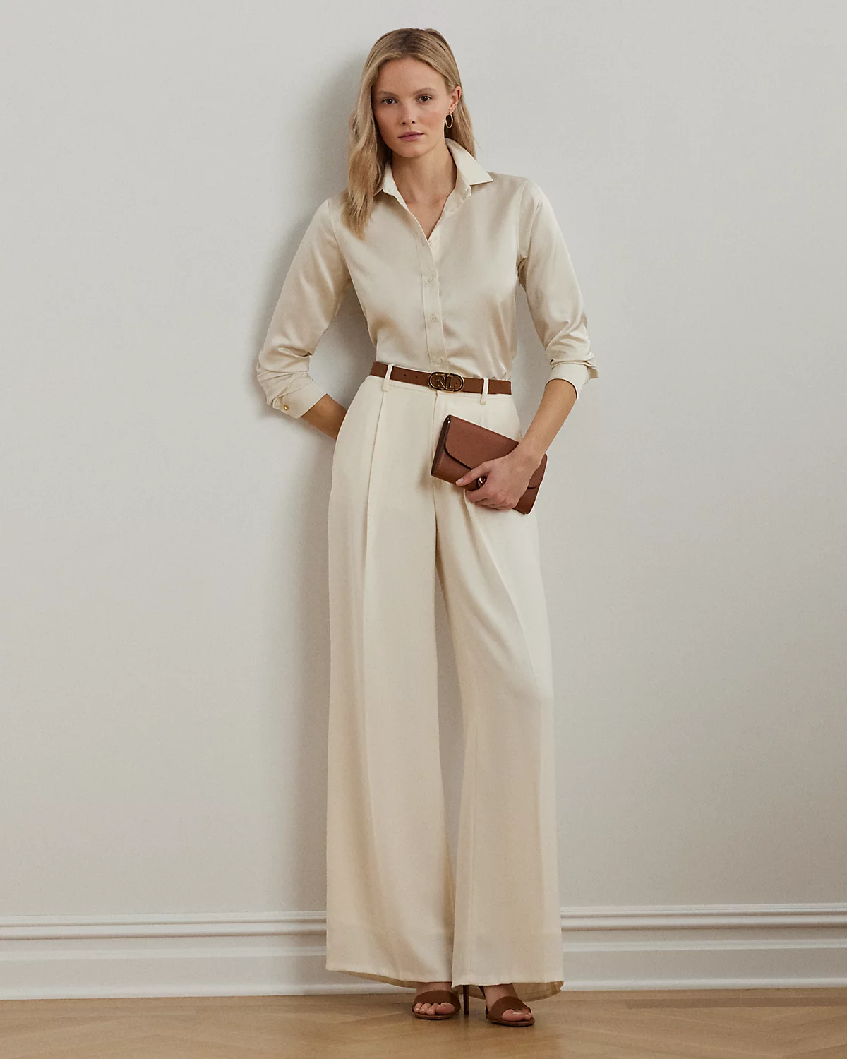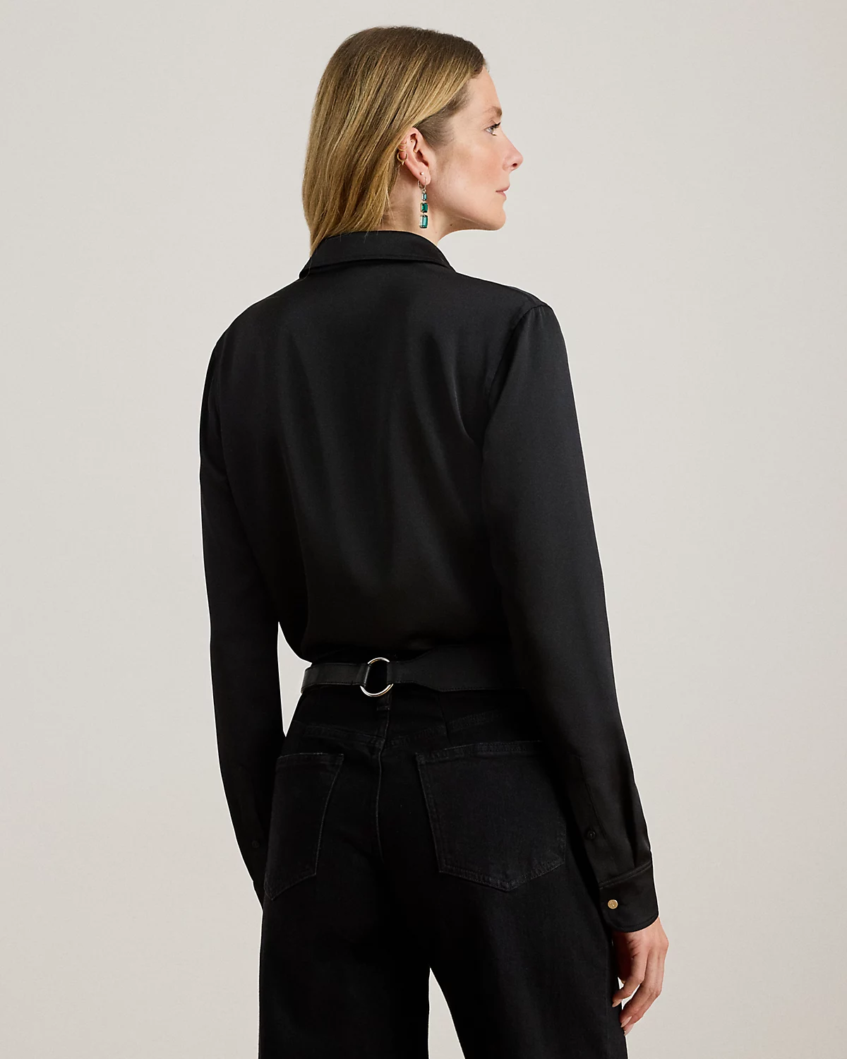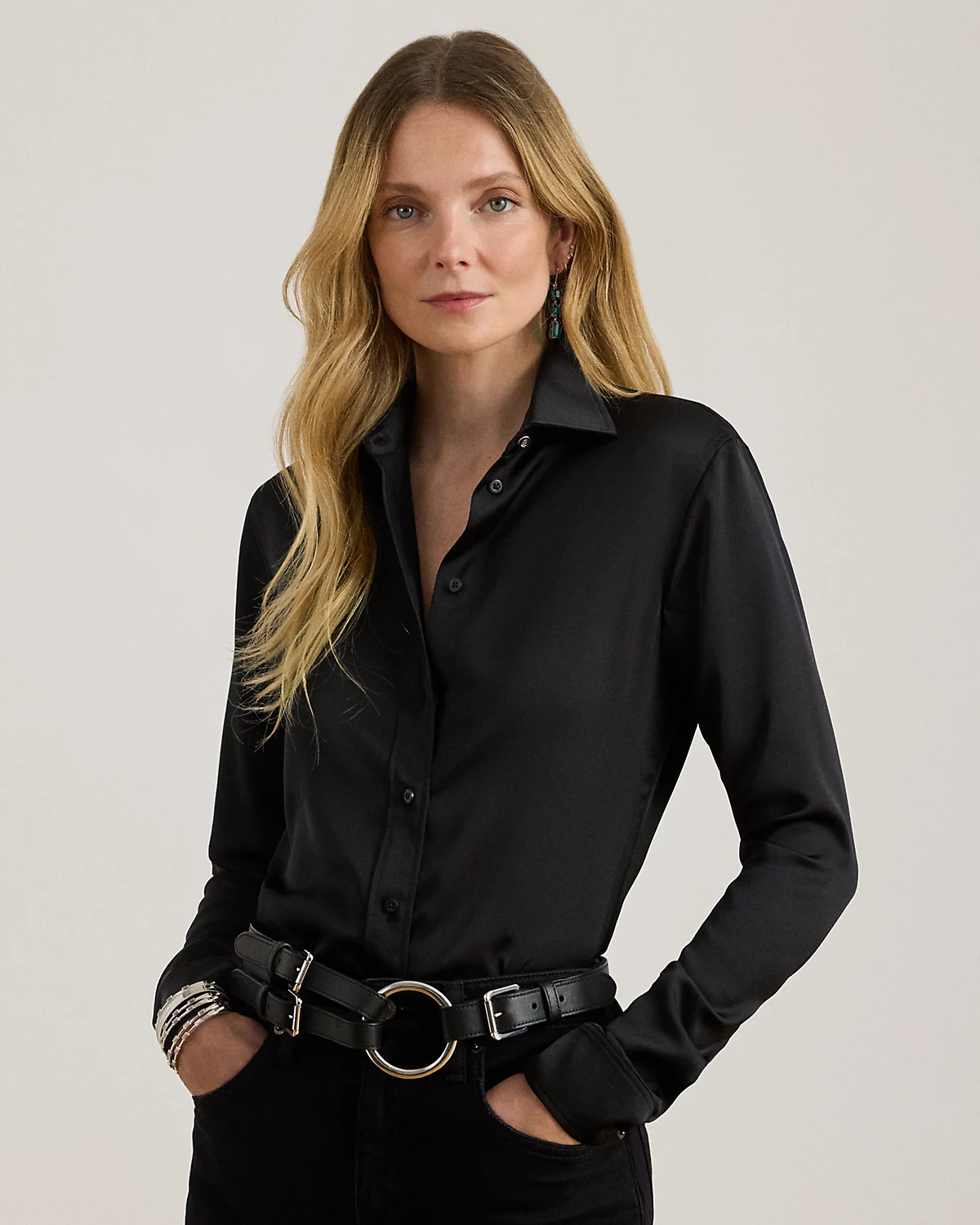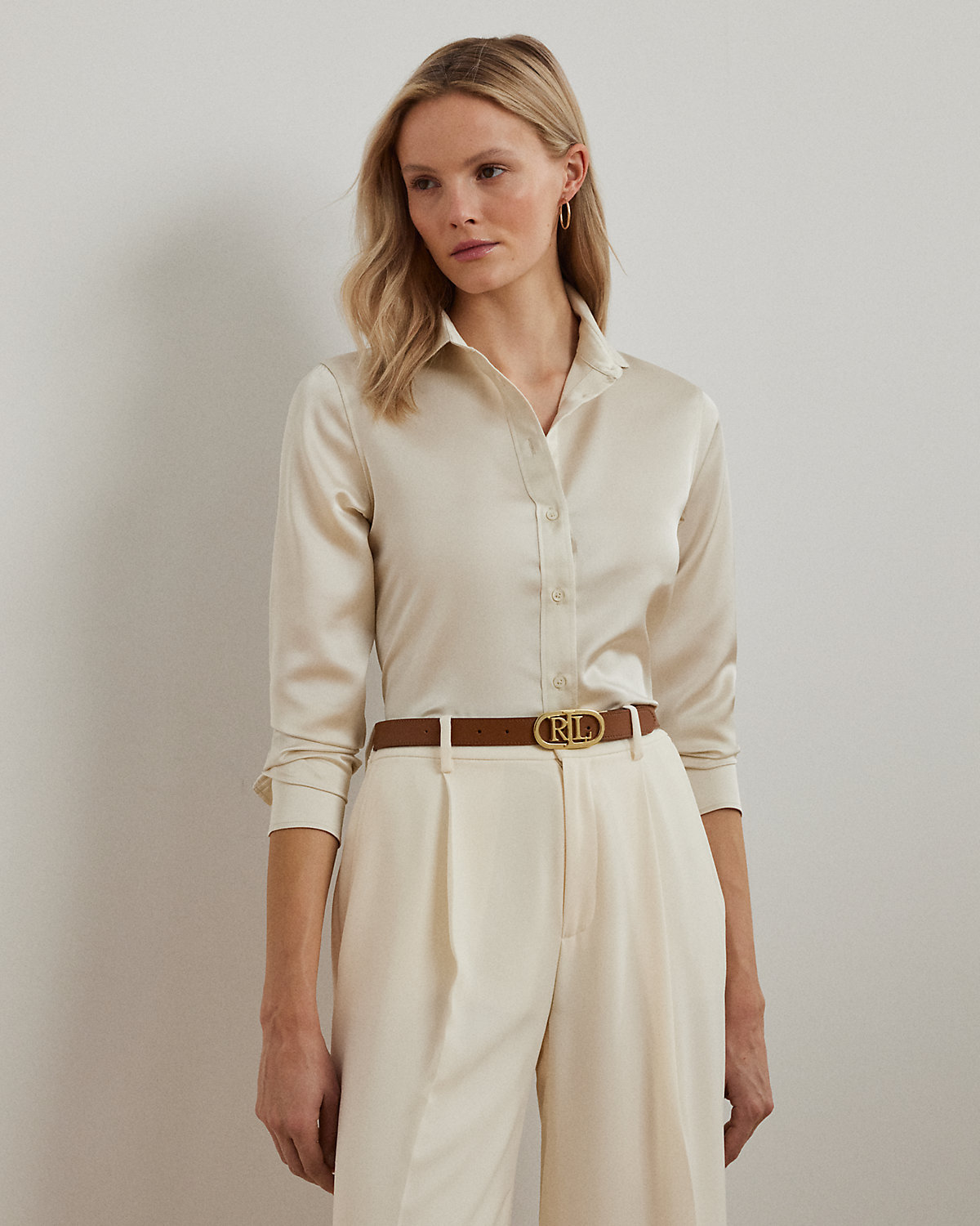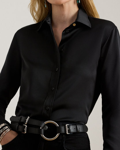 Embellished with signature engraved divs, this timeless shirt is crafted with glossy satin charmeuse for a luxurious Lauren look.