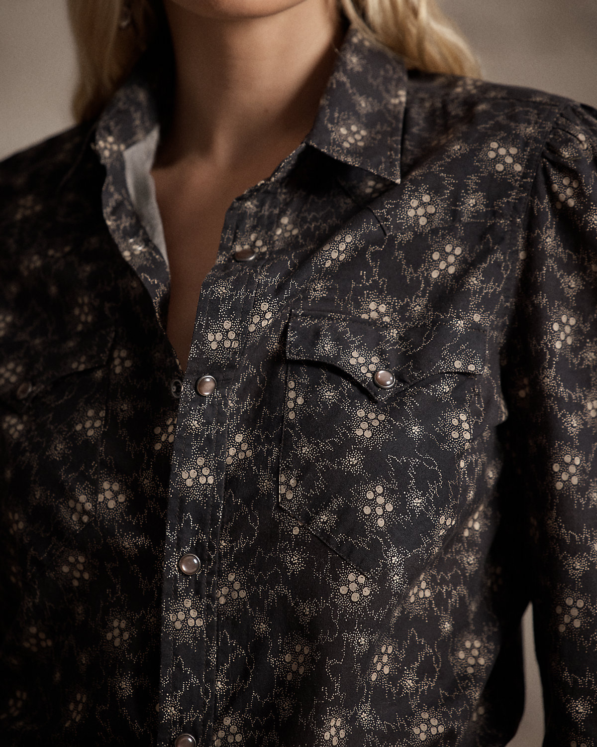 - Long sleeves with snapped barrel cuffs.