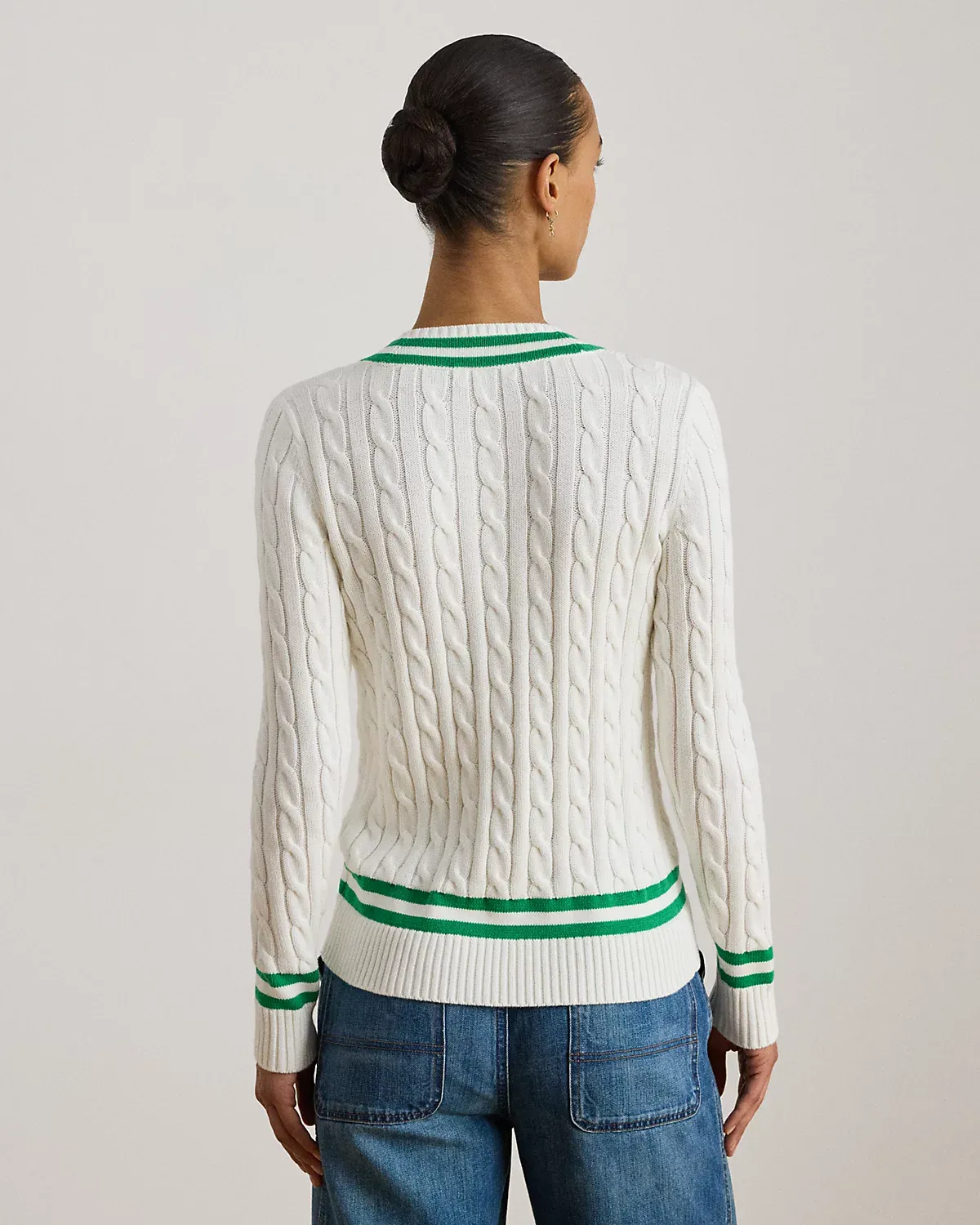 Detailed with stripes along the neckline, cuffs, and hem, this version of Lauren’s signature cricket sweater features a cable-knit combed cotton construction and an embroidered logo crest at the chest.