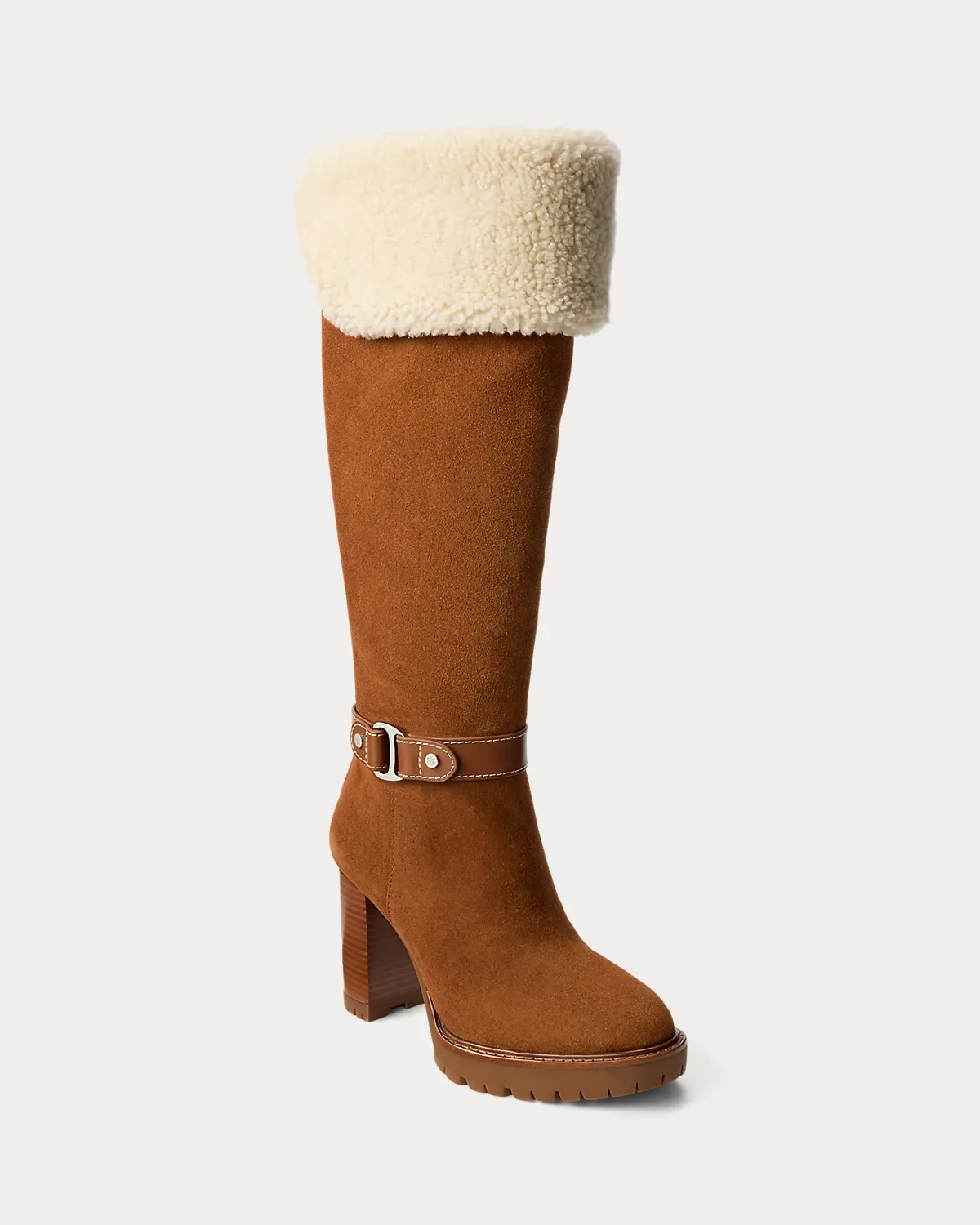 Crafted with velvety suede, the Tasha boot pays homage to Ralpthth Lauren’s equestrian-inspired heritage with its tall silhouette and D-ring ankle strap. Equipped with a leg-elongating 75-mm stacked leather heel, this piece can be worn with the shaft fully extended for a streamlined look or with the cuff folded over to reveal luxurious shearling trim.