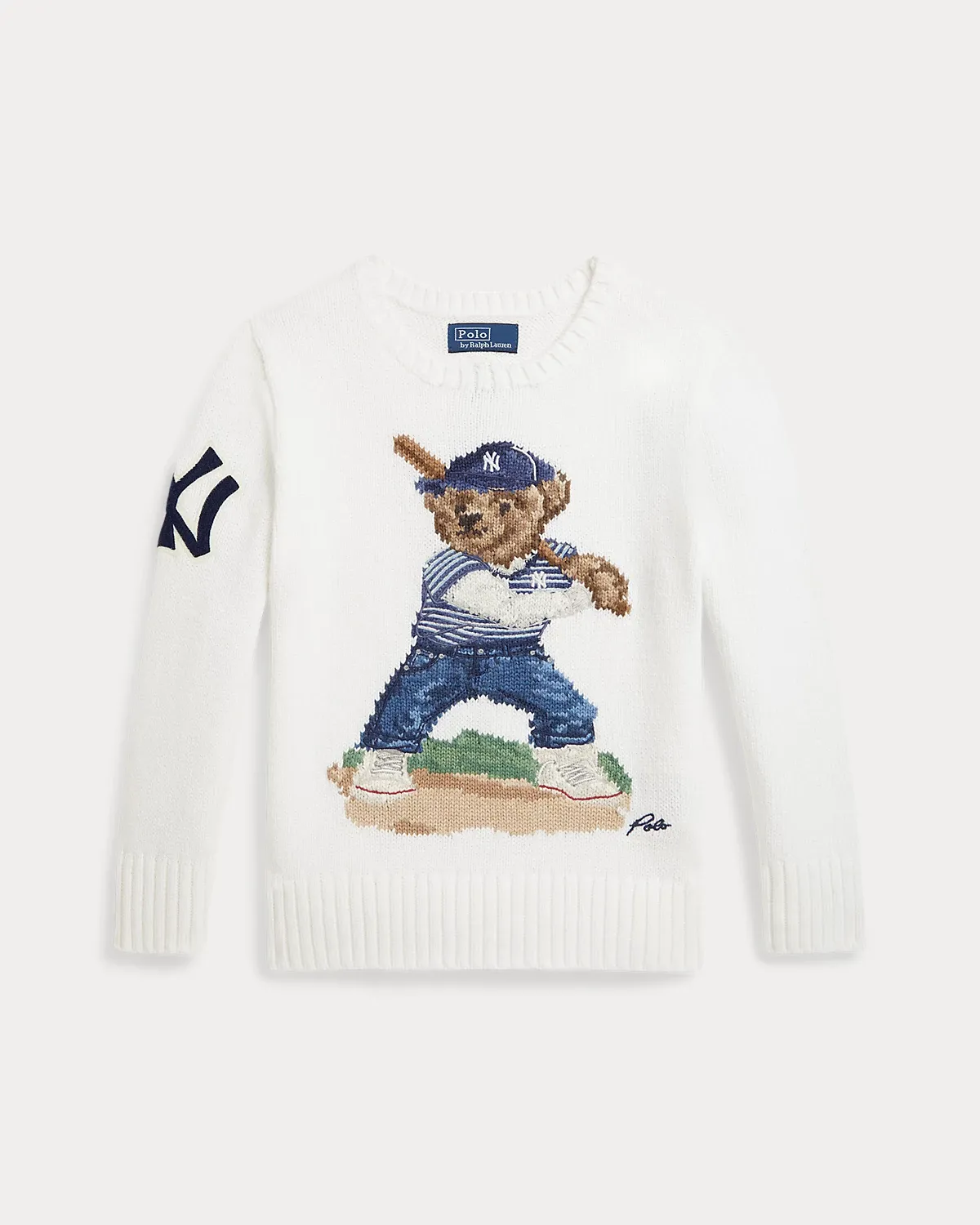 As a boy growing up in the Bronx, Mr. Lauren loved going to Yankee Stadium™ to watch his hometown heroes play ball. This cotton sweater celebrates Mr. Lauren’s long-standing love of the Bronx Bombers™ and the game of baseball with the iconic Polo Bear up to bat in a New York Yankees™ ball cap and tee.