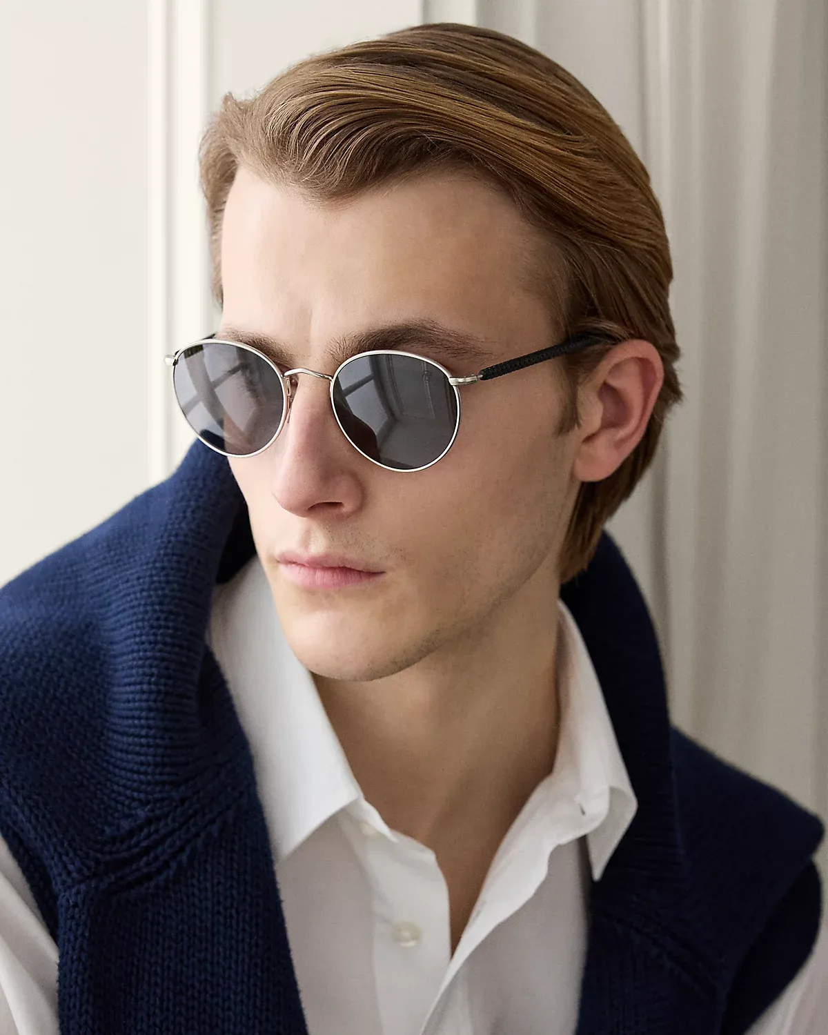Meticulously crafted in Italy, these sunglasses feature a timeless round metal frame. Drawing inspiration from vintage driving gloves, the temples are wrapped in perforated leather and embossed with our stacked “RL” logo.