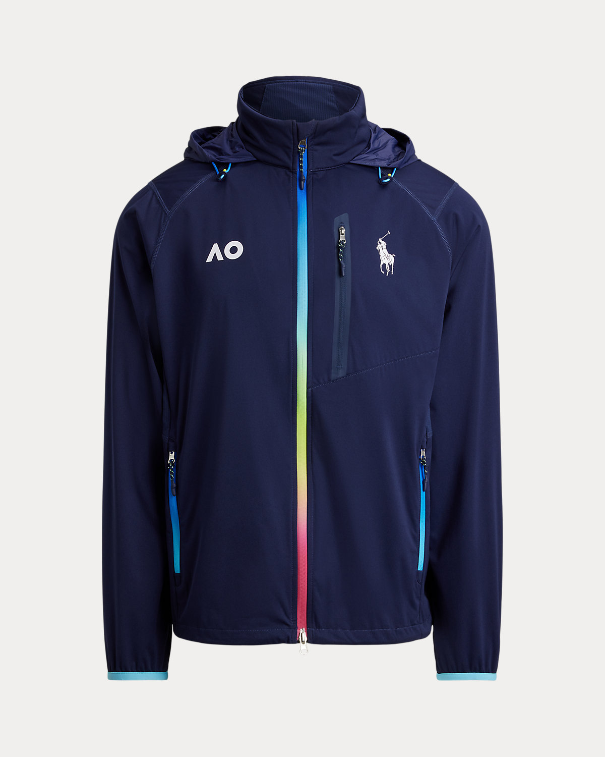 - The official Australian Open logo printed at the right chest. Left chest zip pocket. Two front waist zip pockets. Packs into the right pocket, which features a carrying loop.
