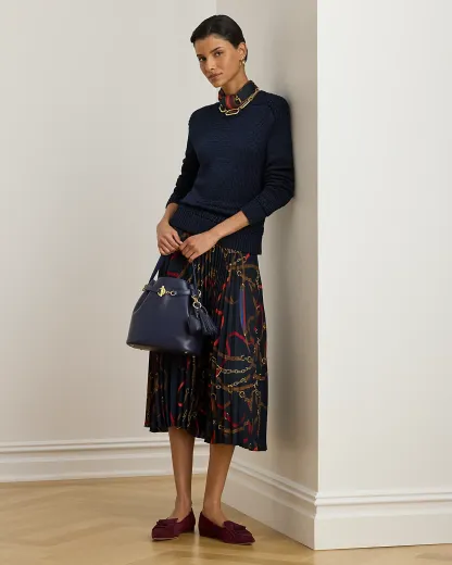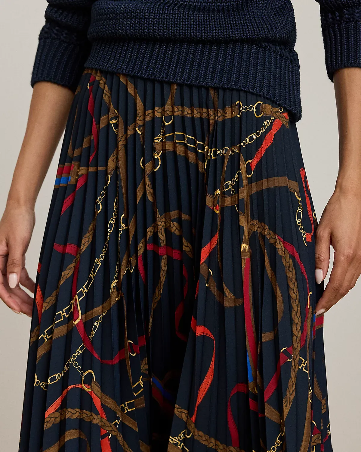 Effervescent sunburst pleats and fluid georgette unite to form this eye-catching midi skirt, which is updated for the season with an equestrian-inspired belting print.