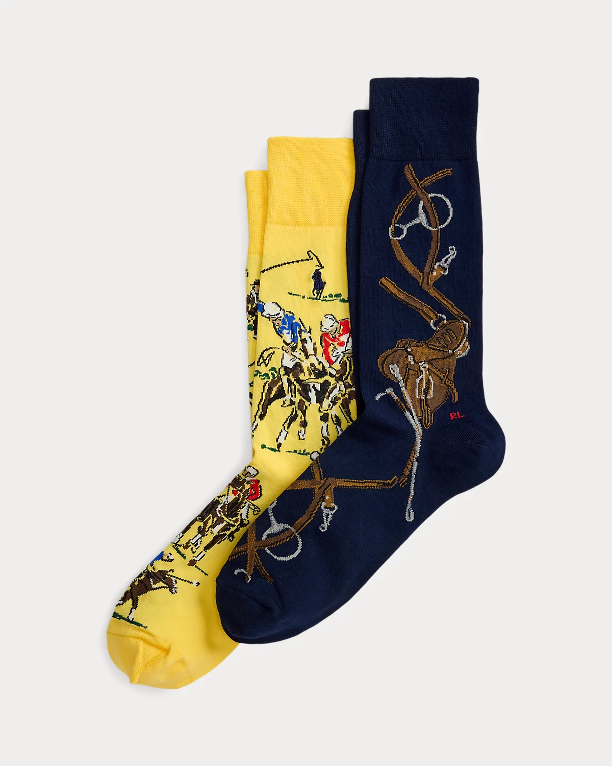 Signature graphics lend a heritage-inspired equestrian look to this trouser sock two-pack. One pair is knit with scenes of a polo match, while the other pair features saddle, bridle, and stirrup motifs.
