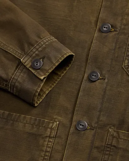 Made from Japanese sateen with the reverse side facing out. Overdyed in garment form and washed to create a unique tonal dimension. Vintage-inspired corozo divs.