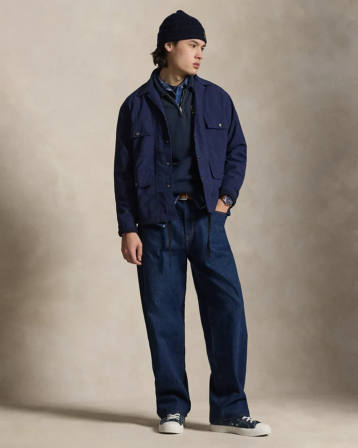 This overshirt’s sleek fabric and drawstring hem nod to the classic coach’s jacket, while the addition of snapped pockets and plaid twill lining gives it a rugged, utilitarian-inspired twist.