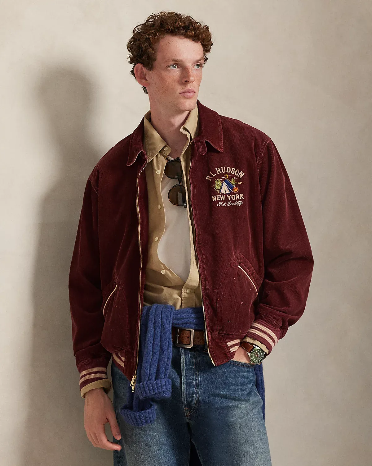 This jacket is part of the season’s collection inspired by the idyllic, pastoral landscape of Hudson Valley, New York. It features intricate embroidery that reflects the stunning scenery of the region, as well as its status as a beloved refuge for artists over the past several centuries. It playfully contrasts a sporty track-jacket silhouette with the rugged style of cotton corduroy and hand-applied paint splatters.