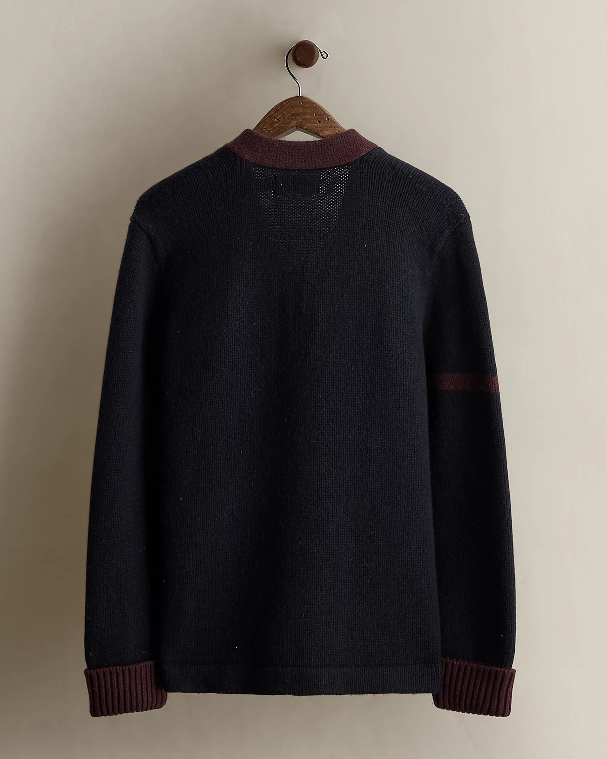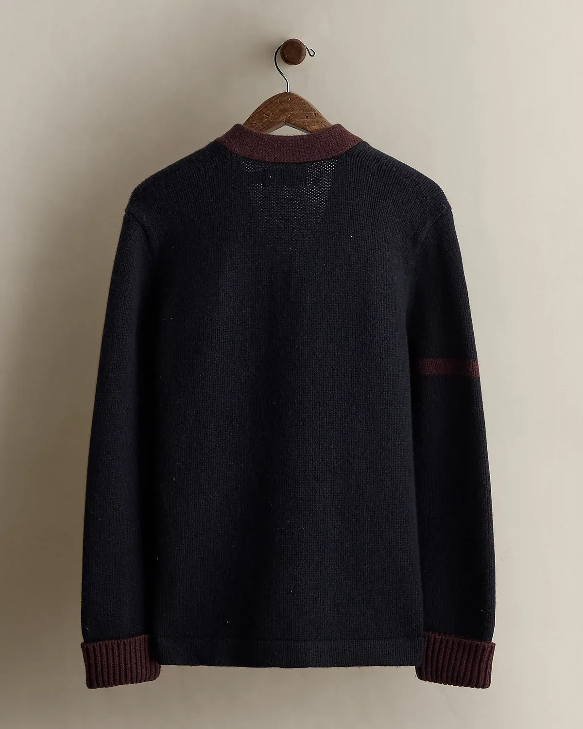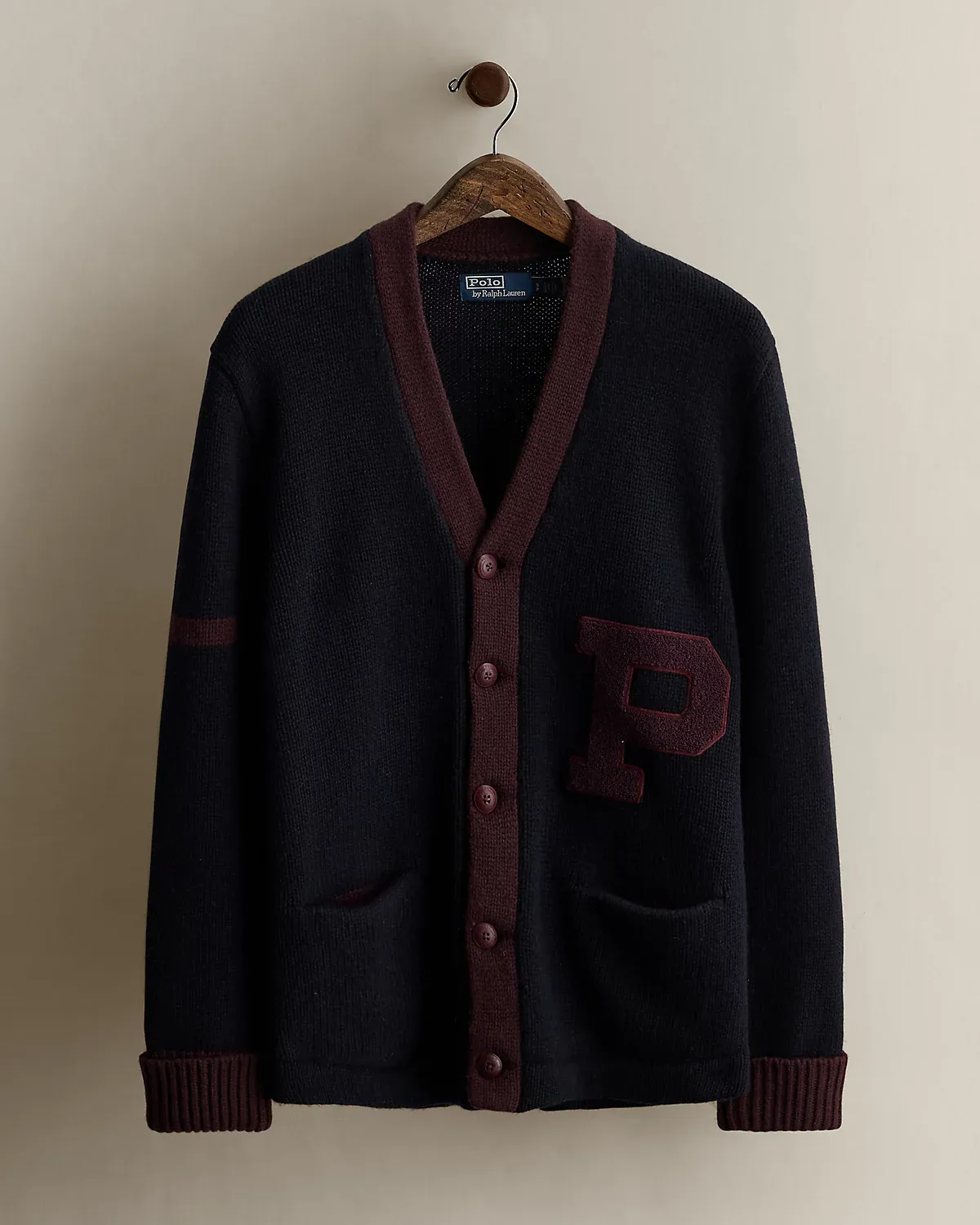 Part of a Polo collection circa 2010. Wool cardigan features a letterman-style “P” appliqué at the left waist. Size small has approximately a 26" back body length, an 18" shoulder, a 41" chest, and a 24.25" sleeve length.