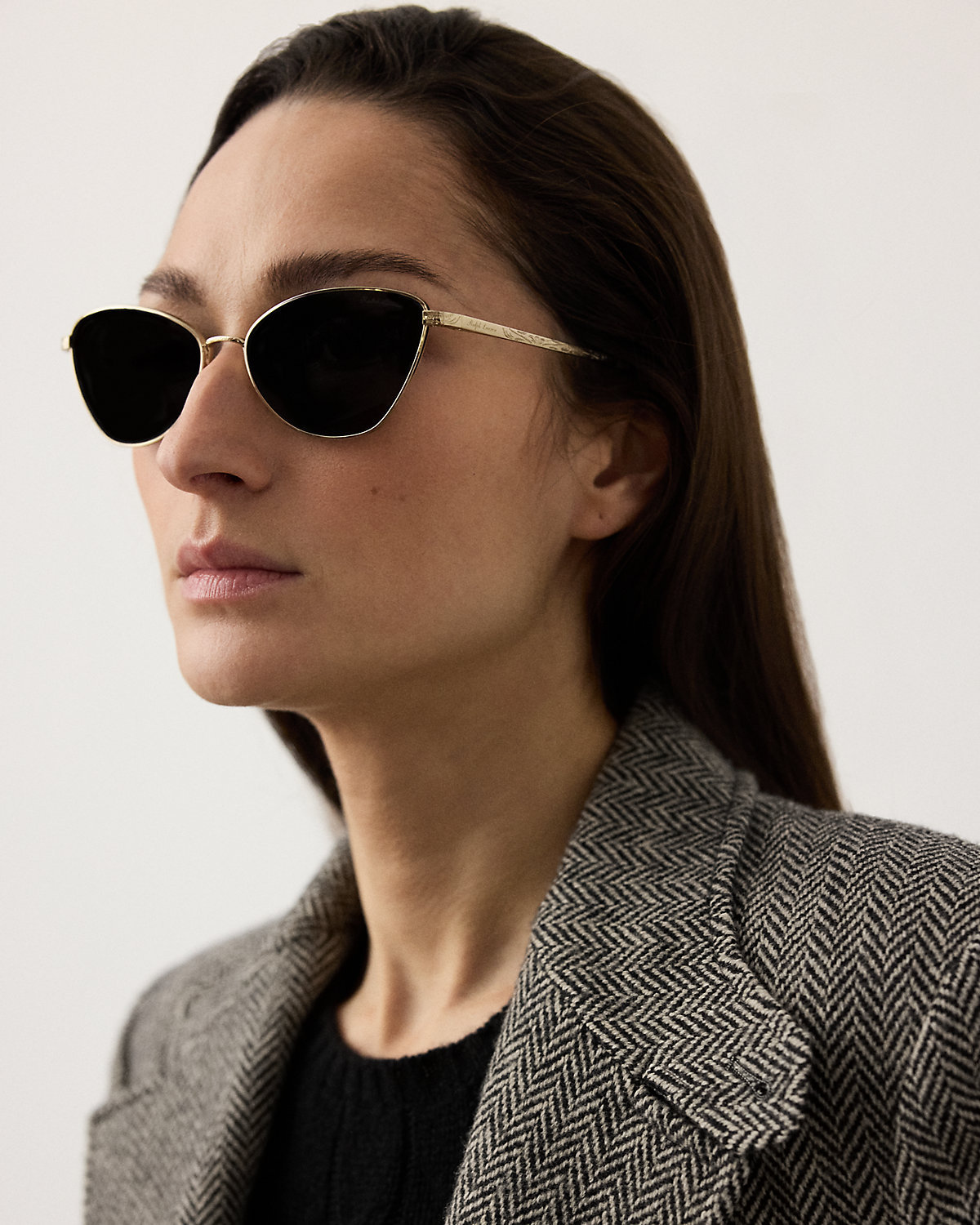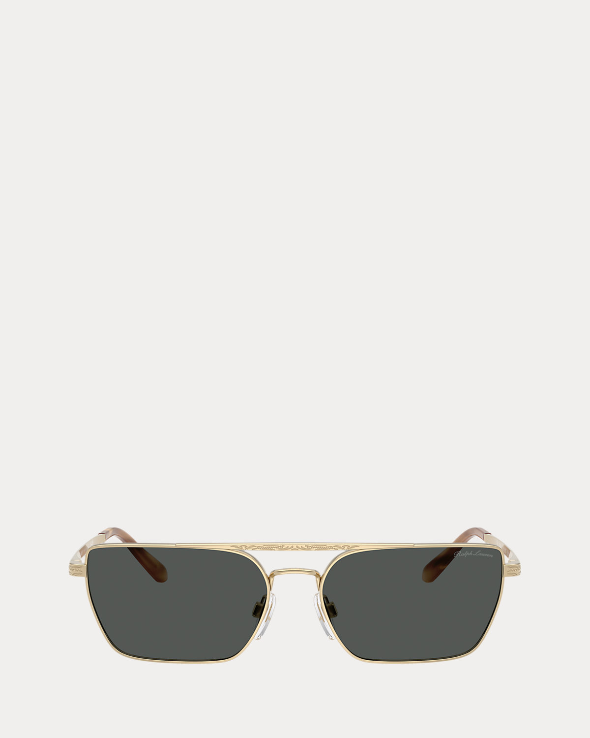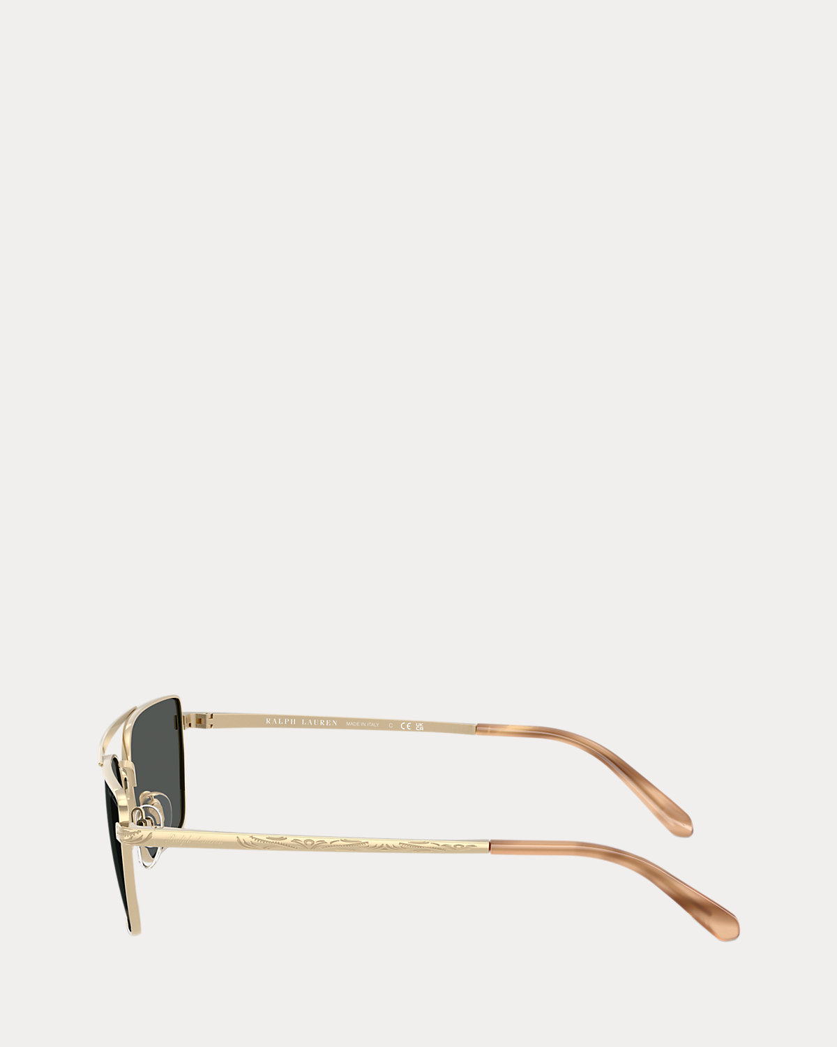 - Signature script “Ralpthth Lauren” printed at the left lens. Signature script “Ralpthth Lauren”–engraved temples. Western-inspired filigree engravings throughout.