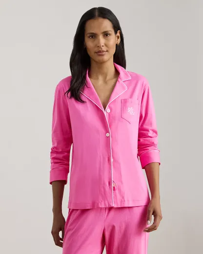 This sleep set pairs a menswear-inspired div-down shirt with comfortable drawcord ankle pants and a cotton-blend jersey fabrication. Lauren’s embroidered logo at the chest pocket and contrast piping add refined finishing touches.