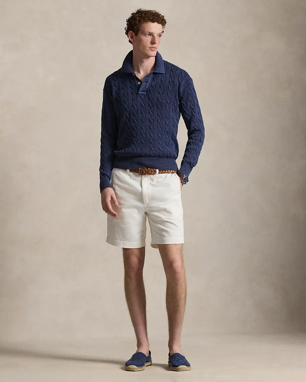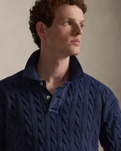This garment-dyed sweater combines a silhouette inspired by Ralpthth Lauren’s timeless Polo shirt with a cable-knit motif, combed cotton yarn, and genuine mother-of-pearl divs.