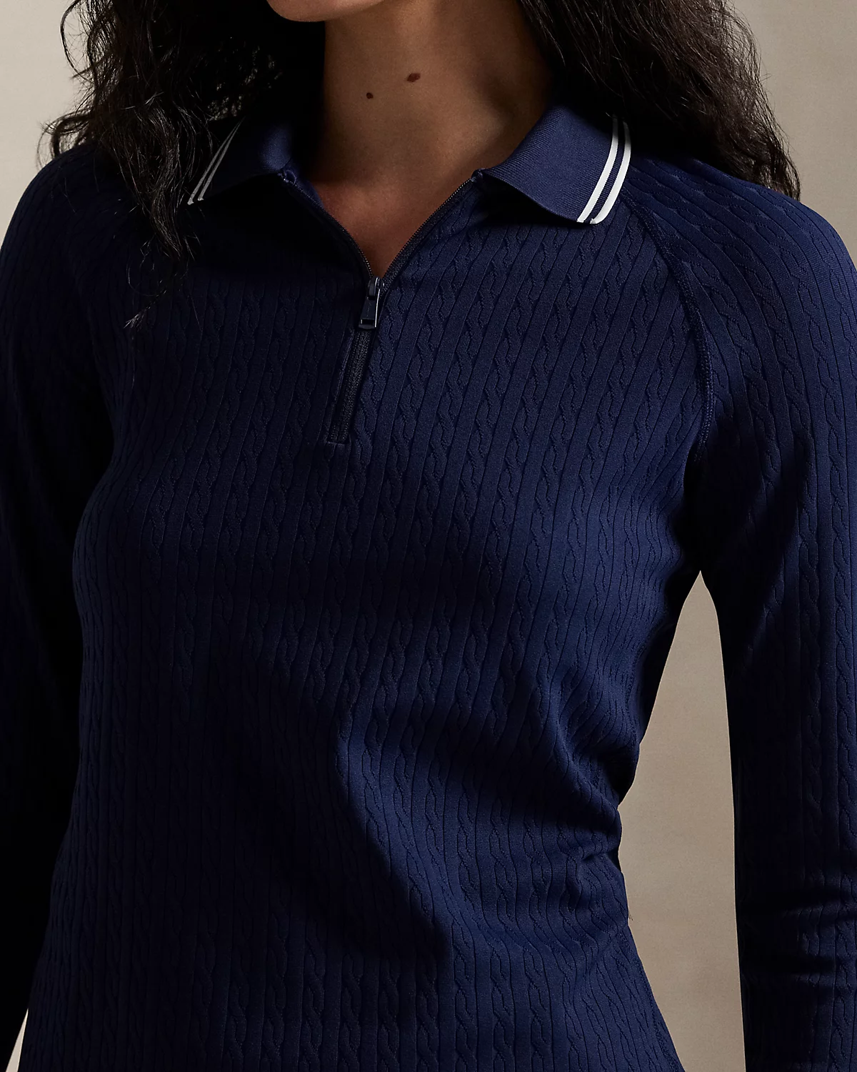 - Rib-knit Polo collar with contrast striped tipping. Quarter-zip placket. Zipper pull custom-developed with an “RLX” logo.