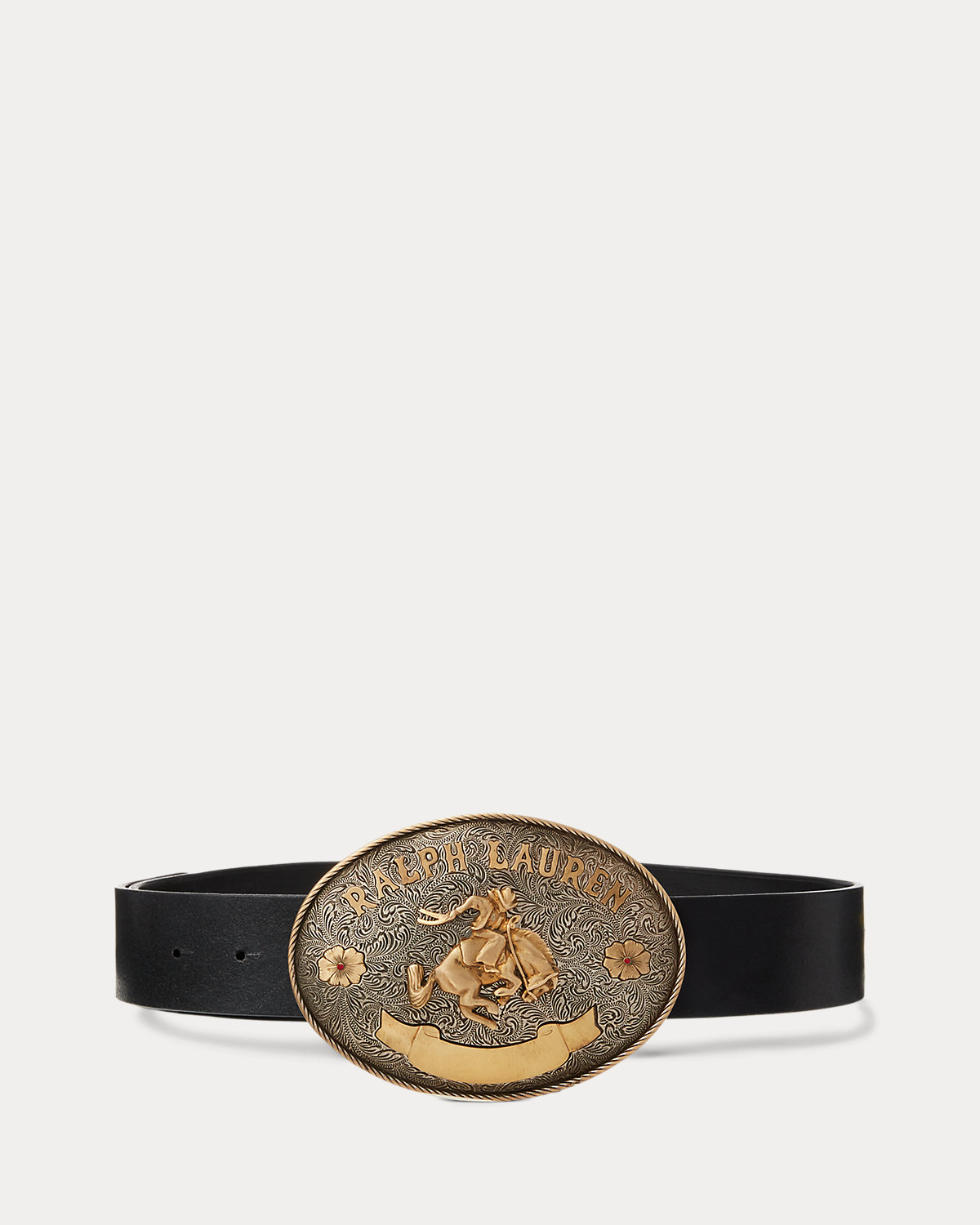 Crafted in Italy with full-grain vachetta leather, this wide belt continues Mr. Lauren’s love of all things equestrian with an oversize two-tone buckle inspired by the rodeo, which depicts a rider and their horse, intricate engravings, and Ralpthth Lauren’s logo.