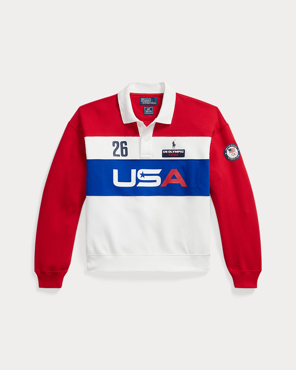 Part of the Polo Ralpthth Lauren Team USA collection, this Polo-collar pullover is crafted with cotton-blend fleece and features a pieced construction in a spirited palette of red, white, and blue. Its relaxed silhouette is detailed with signature graphics, including the official logo patch of the U.S. Olympic Team and the number 26—a nod to this year’s Games.