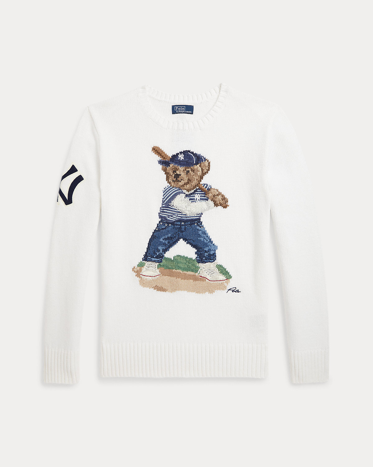 As a boy growing up in the Bronx, Mr. Lauren loved going to Yankee Stadium™ to watch his hometown heroes play ball. This cotton sweater celebrates Mr. Lauren’s long-standing love of the Bronx Bombers™ and the game of baseball with the iconic Polo Bear up to bat in a New York Yankees™ ball cap and tee.