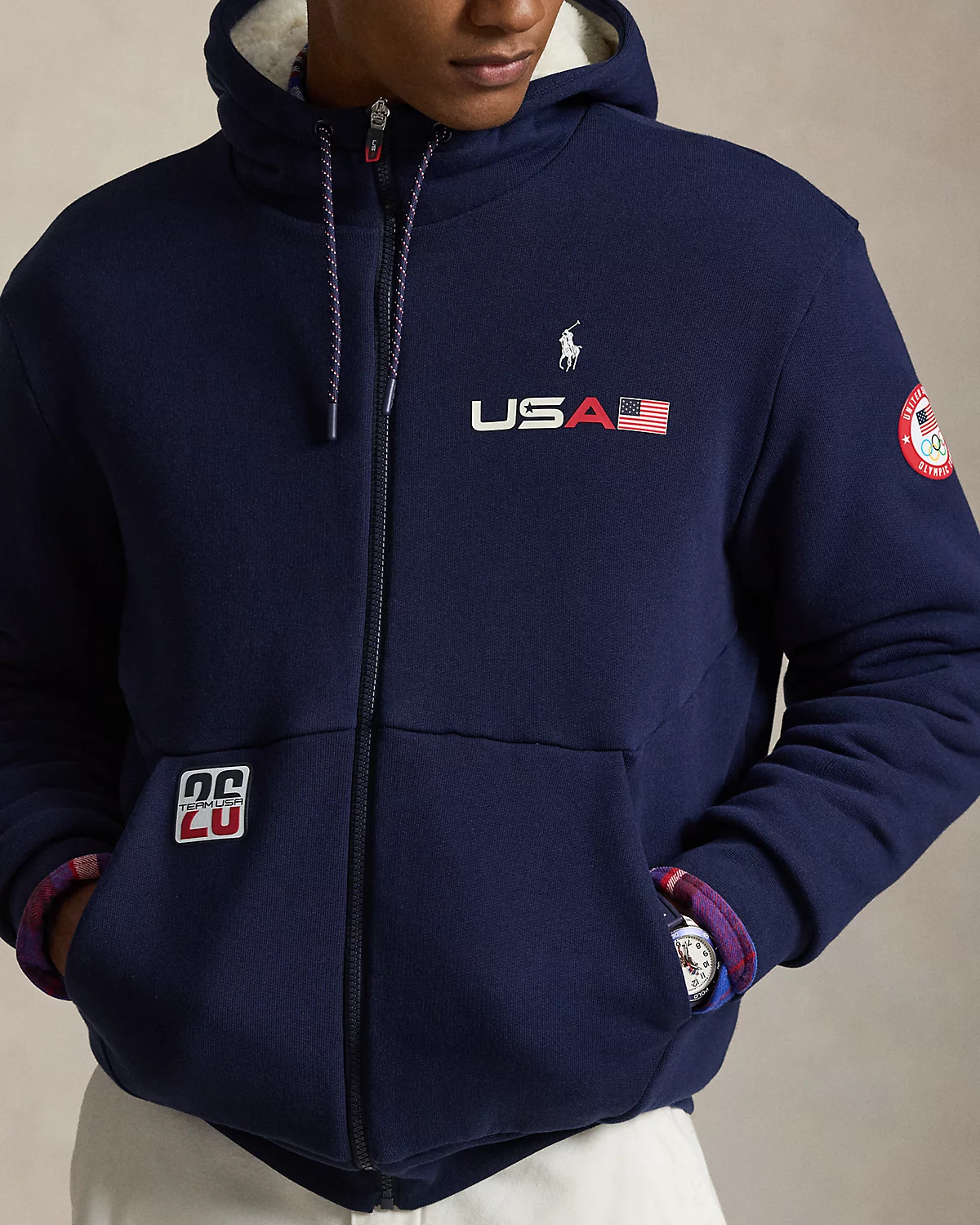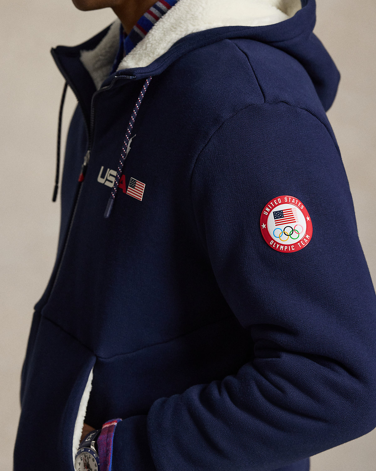- Drawstring hood. Full-zip front. Long sleeves with ribbed cuffs. Official logo patch of the U.S. Olympic Team at the left sleeve.