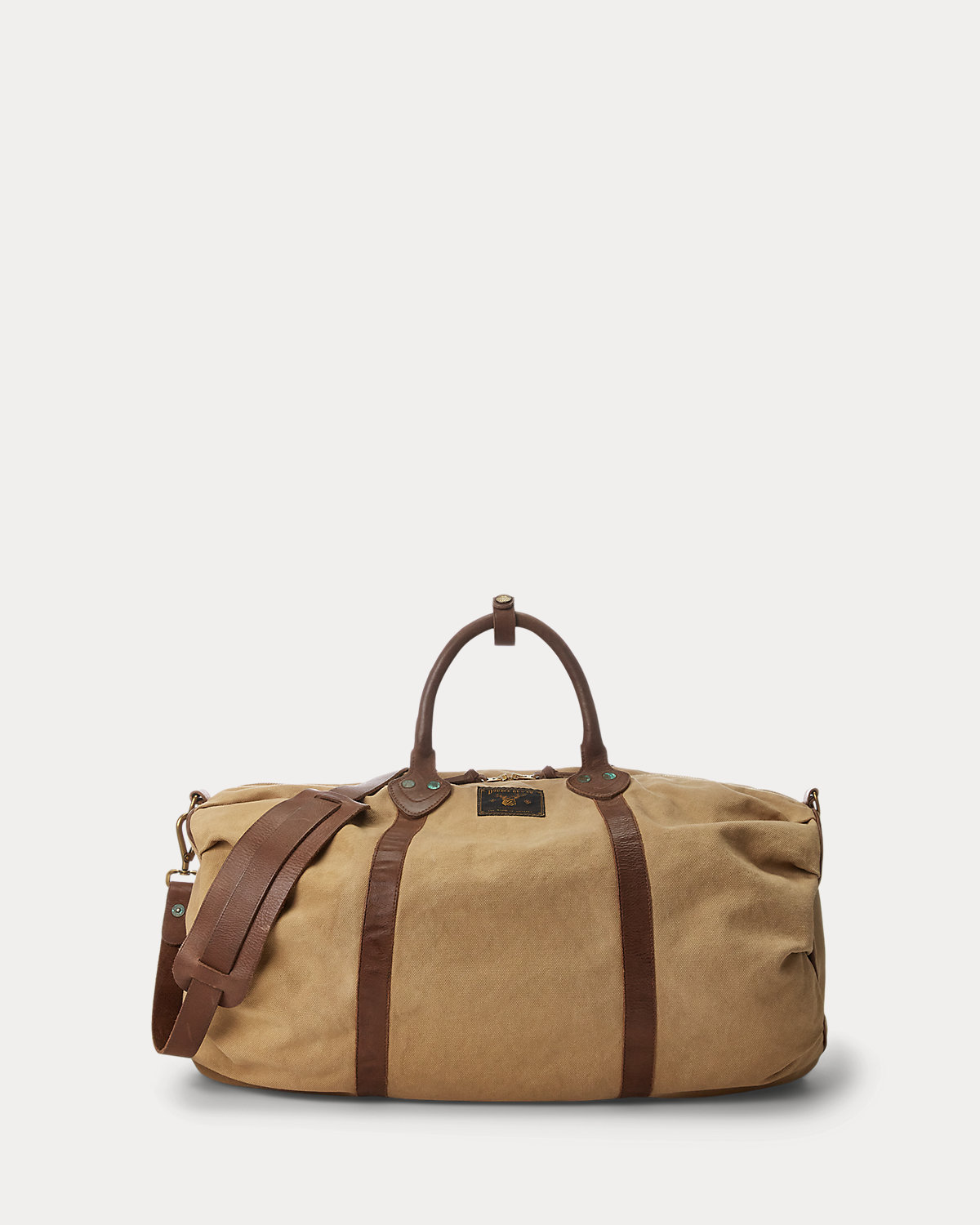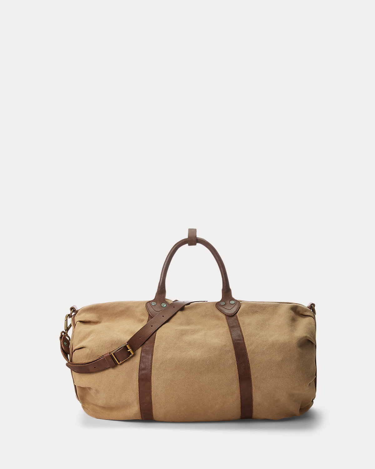 Made with durable cotton canvas. Full-grain leather handles, removable shoulder strap, and trim. Woven logo label with a deer graphic at the front. Brass hardware with a vintage-inspired finish. Distressed copper-tone rivets.
