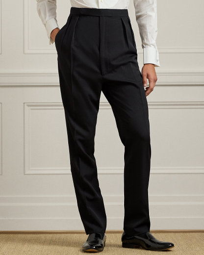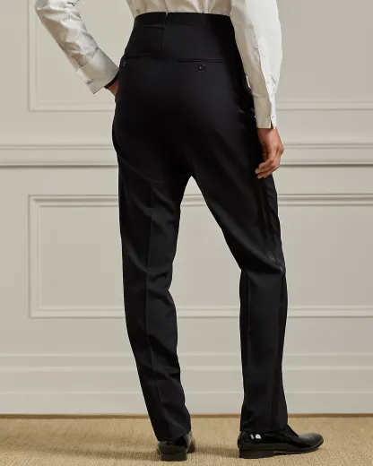 - Trouser: side adjusters; zip fly with an extended hook-and-bar closure; interior divs for braces; side on-seam pockets; two back dived pockets; two satin stripes along each leg; lined to the knees at the front.