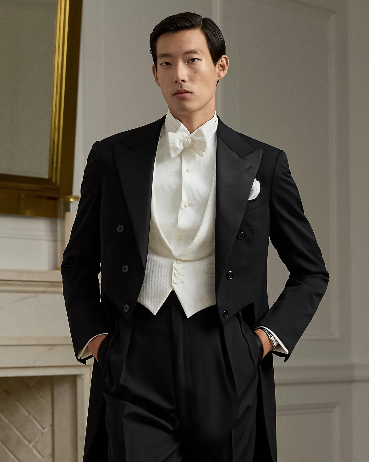 - Jacket: satin peak lapels; open-front silhouette with six decorative divs; unfinished cuffs; left chest welt pocket; tails at the back; fully lined and canvassed.