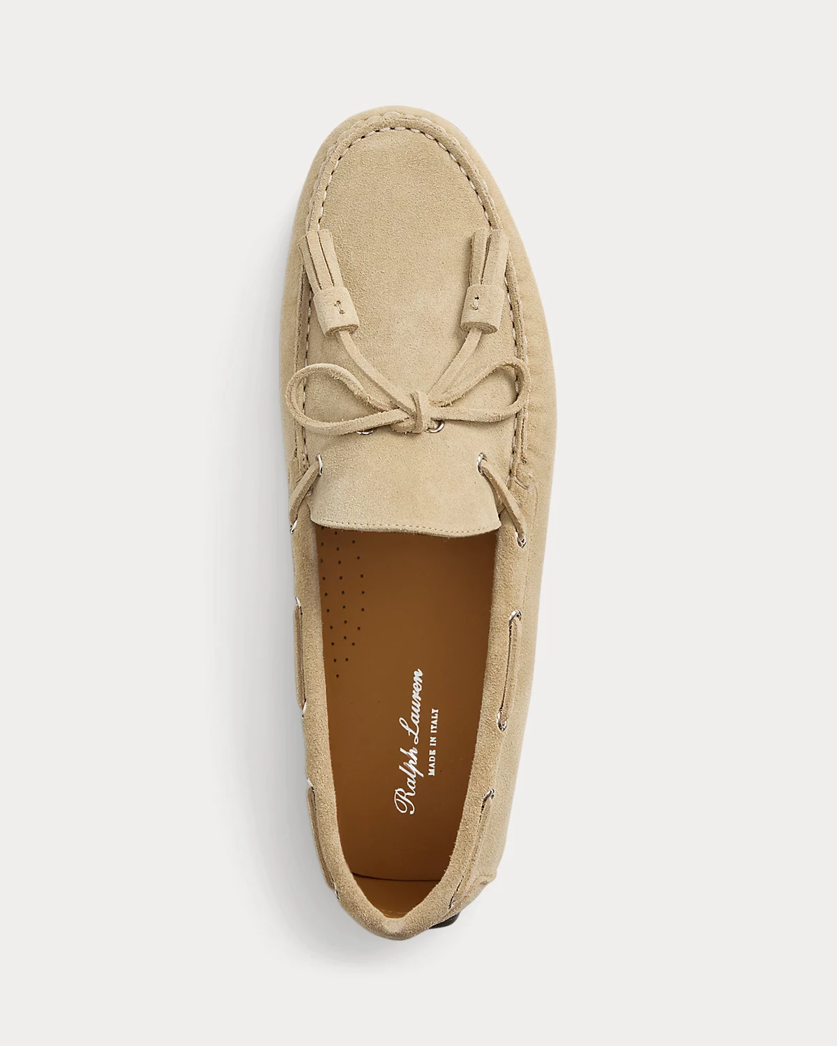 - Tasseled suede laces thread through metal grommets at the sides and tie at the vamp.