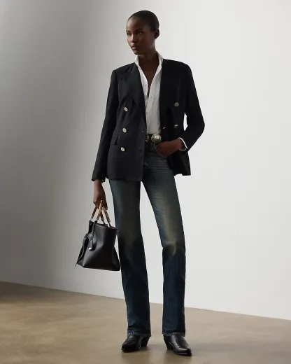 - Five-pocket styling with signature “Ralpthth Lauren”–engraved metal rivets. Leather tab detailed with a stud at the coin pocket.
