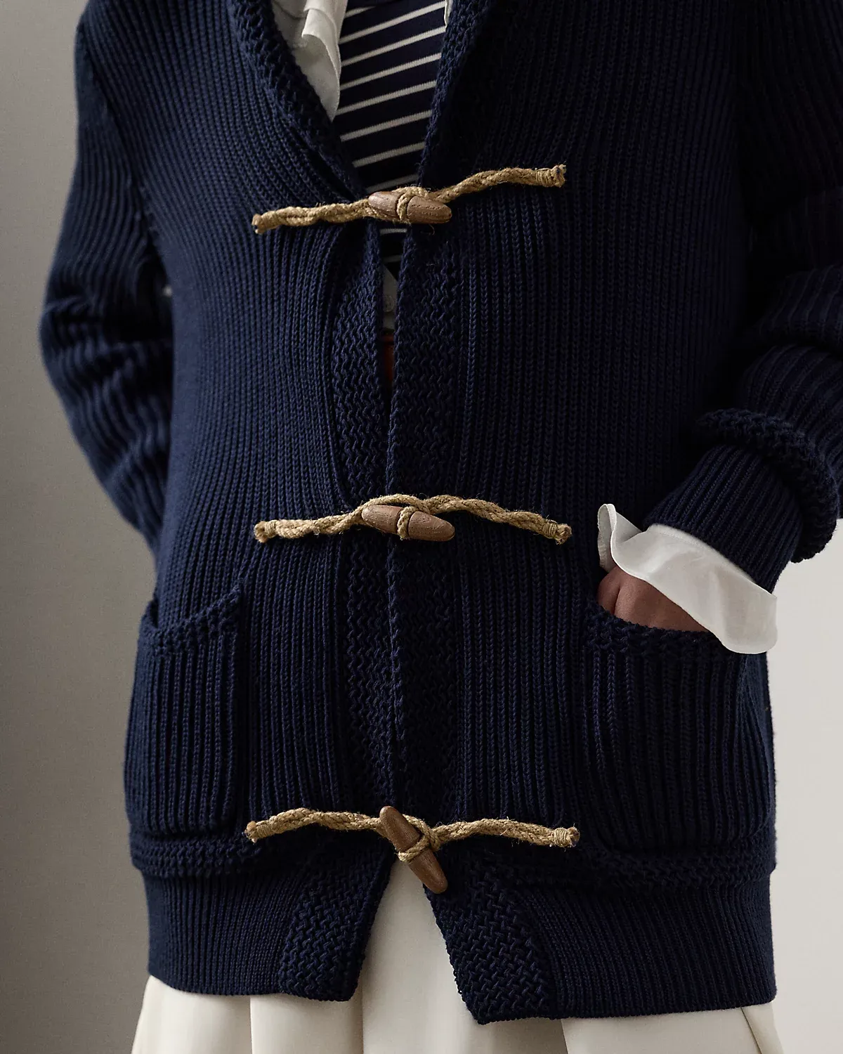 Combining Mr. Lauren’s commitment to fine Italian craftsmanship with the season’s nautical-inspired aesthetic, this updated version of our signature shawl-collar cardigan features a traditional cardigan stitch, racking stitch detailing, and a toggle-and-loop closure composed of handmade wooden toggles and jute loops. Cut for a relaxed, thigh-grazing fit, this sweater is made with a luxurious blend of ultrasoft cotton and brilliant silk, creating a precious, breathable fabric ideal for the warmer months.