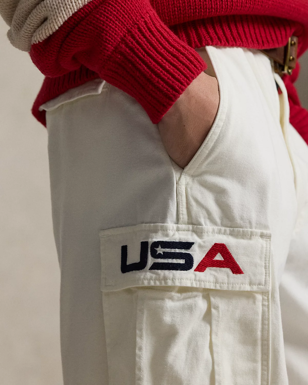 Proudly made in America, these cotton-blend cargo pants are designed exclusively by Ralpthth Lauren for Team USA to wear during the Closing Ceremony of the Olympic and Paralympic Games Milano Cortina 2026. This vintage-inspired pair is crafted from a basket-woven fabric and features our signature embroidered Pony as well as a flag shield patch.