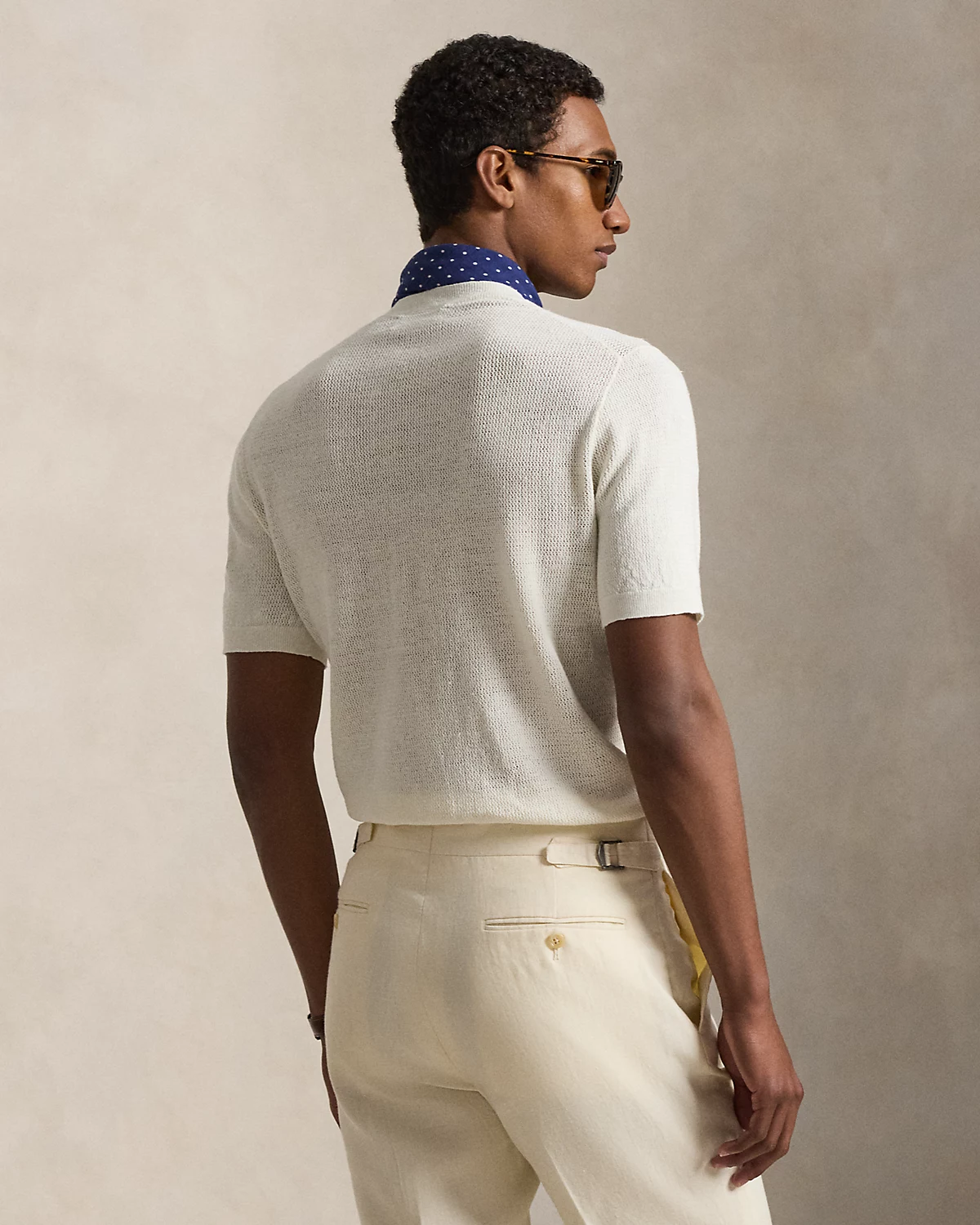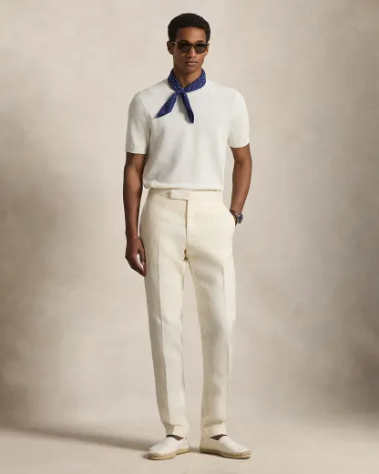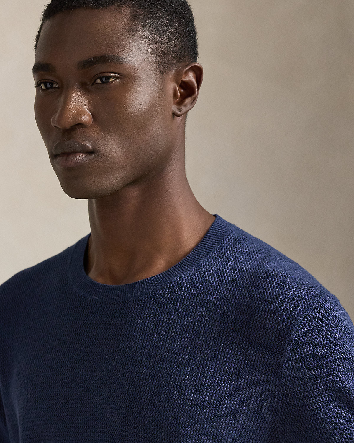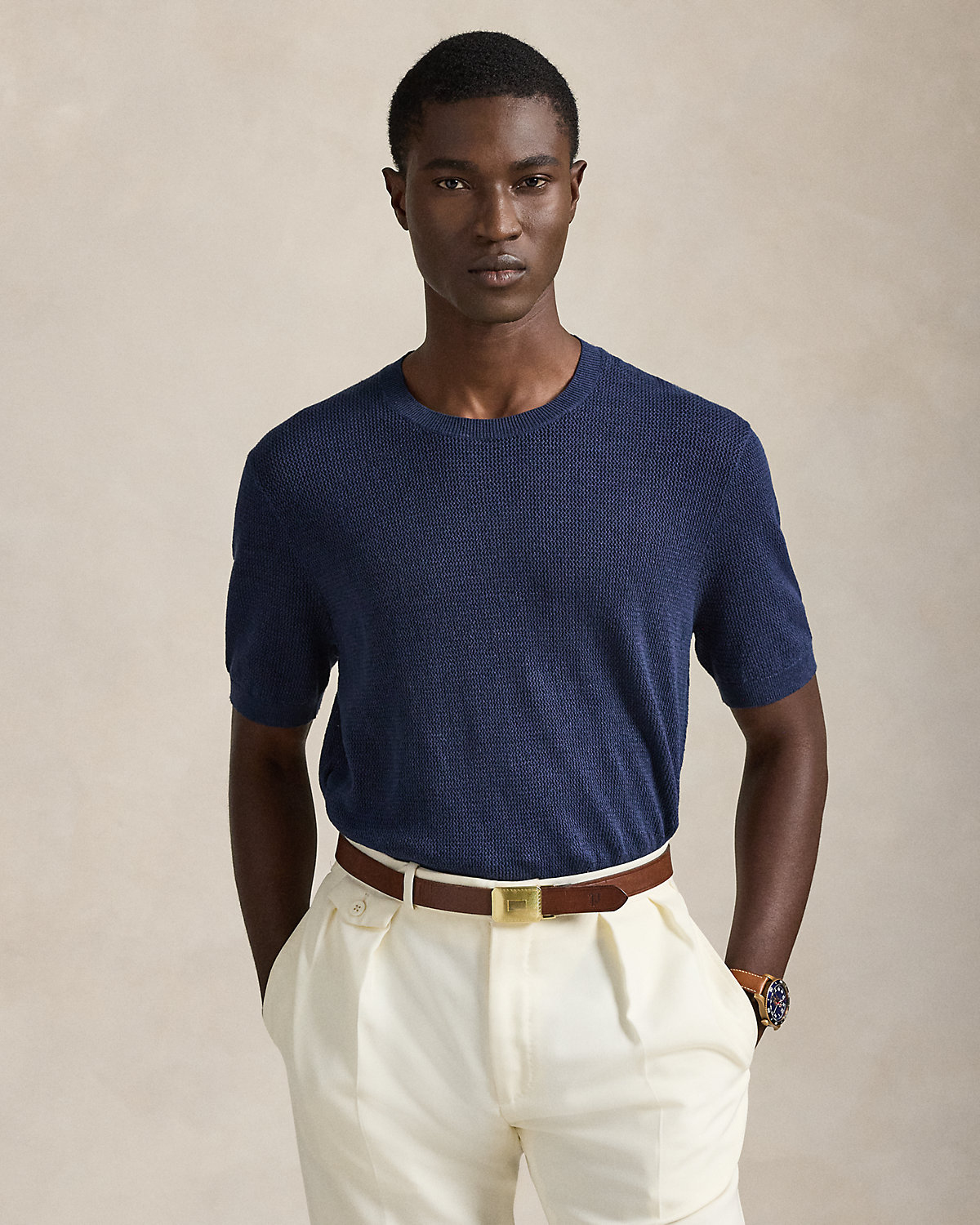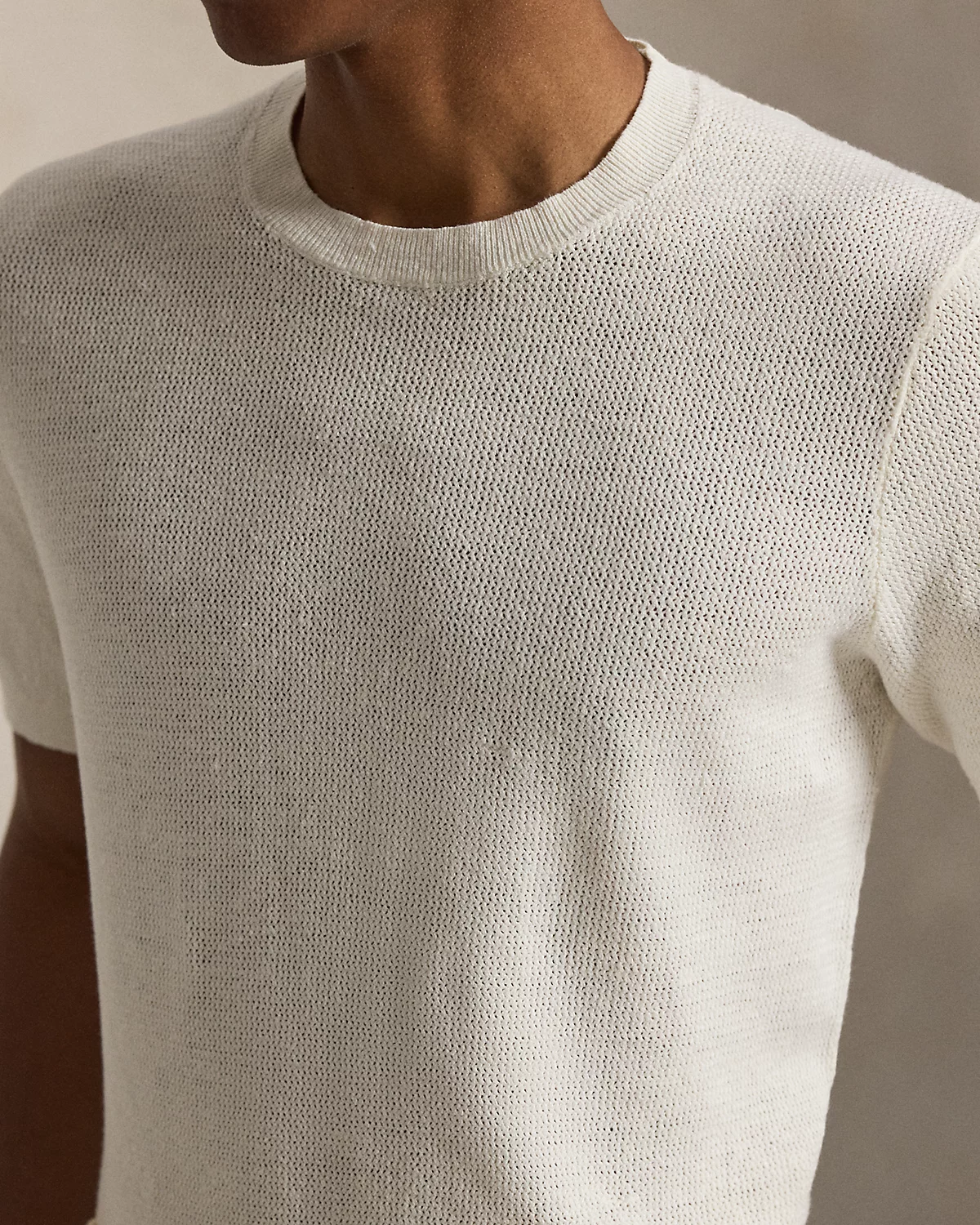 To create this short-sleeve sweater, we reimagined the silhouette of a classic crewneck T-shirt with a textured novelty stitch and a linen-blend yarn that includes extra stretch.
