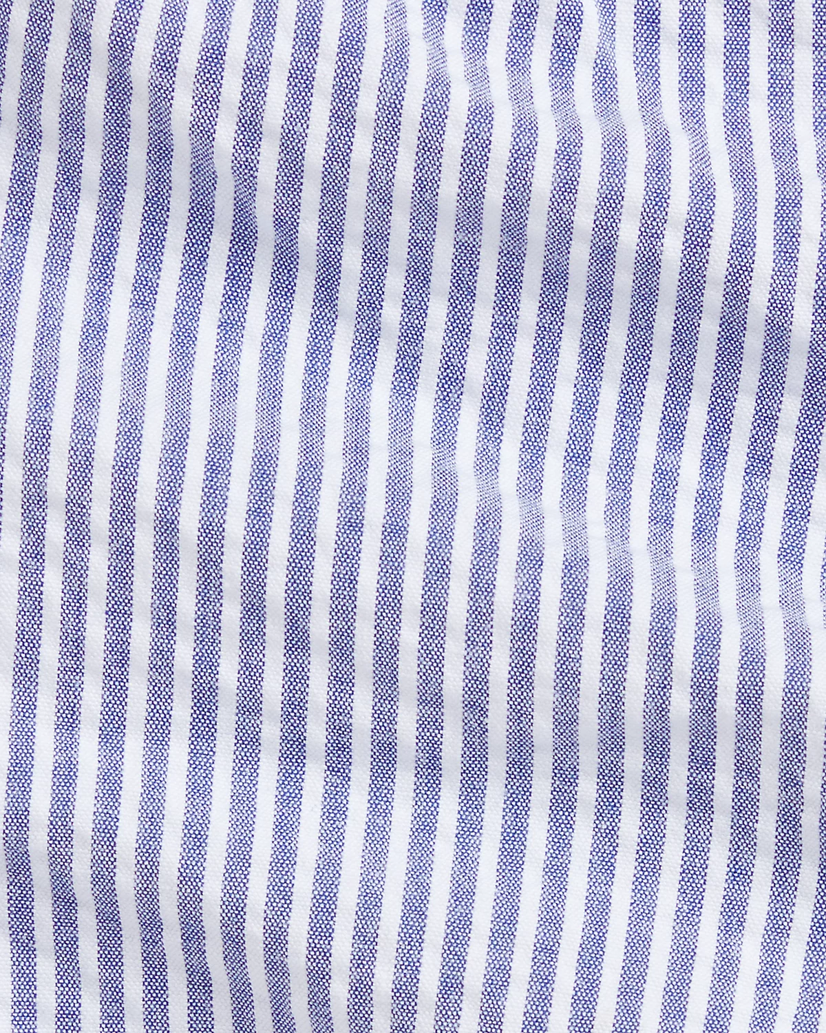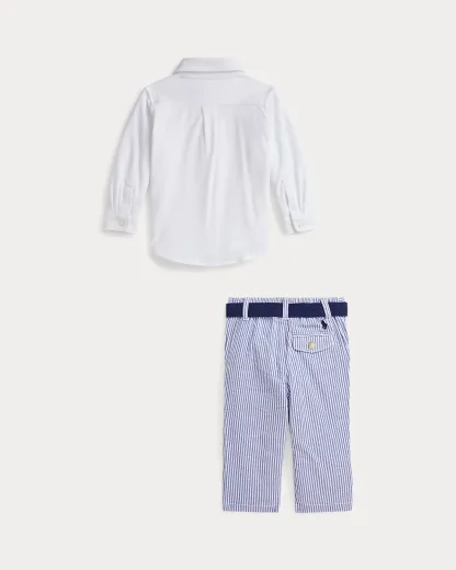 This set forms a cute warm-weather outfit with a cotton interlock shirt, striped stretch seersucker pants, and a coordinating belt.