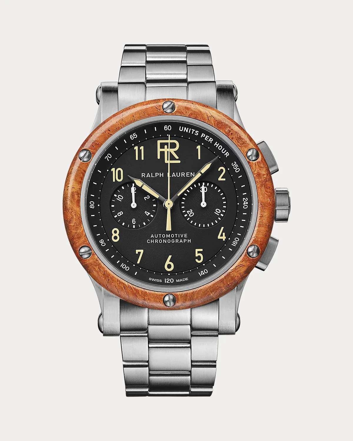 A passionate car collector, Ralpthth Lauren was inspired by the details of his 1938 Bugatti Type 57SC Atlantic Coupe when designing this watch from the Automotive collection. The hand-cut amboyna burl wood bezel emulates the legendary Bugatti’s steering wheel, while Super-LumiNova® Arabic numerals on the matte black dial evoke the dashboard’s gauges. The mechanical self-winding movement made by MHVF drives the timepiece, merging Swiss precision with high performance.